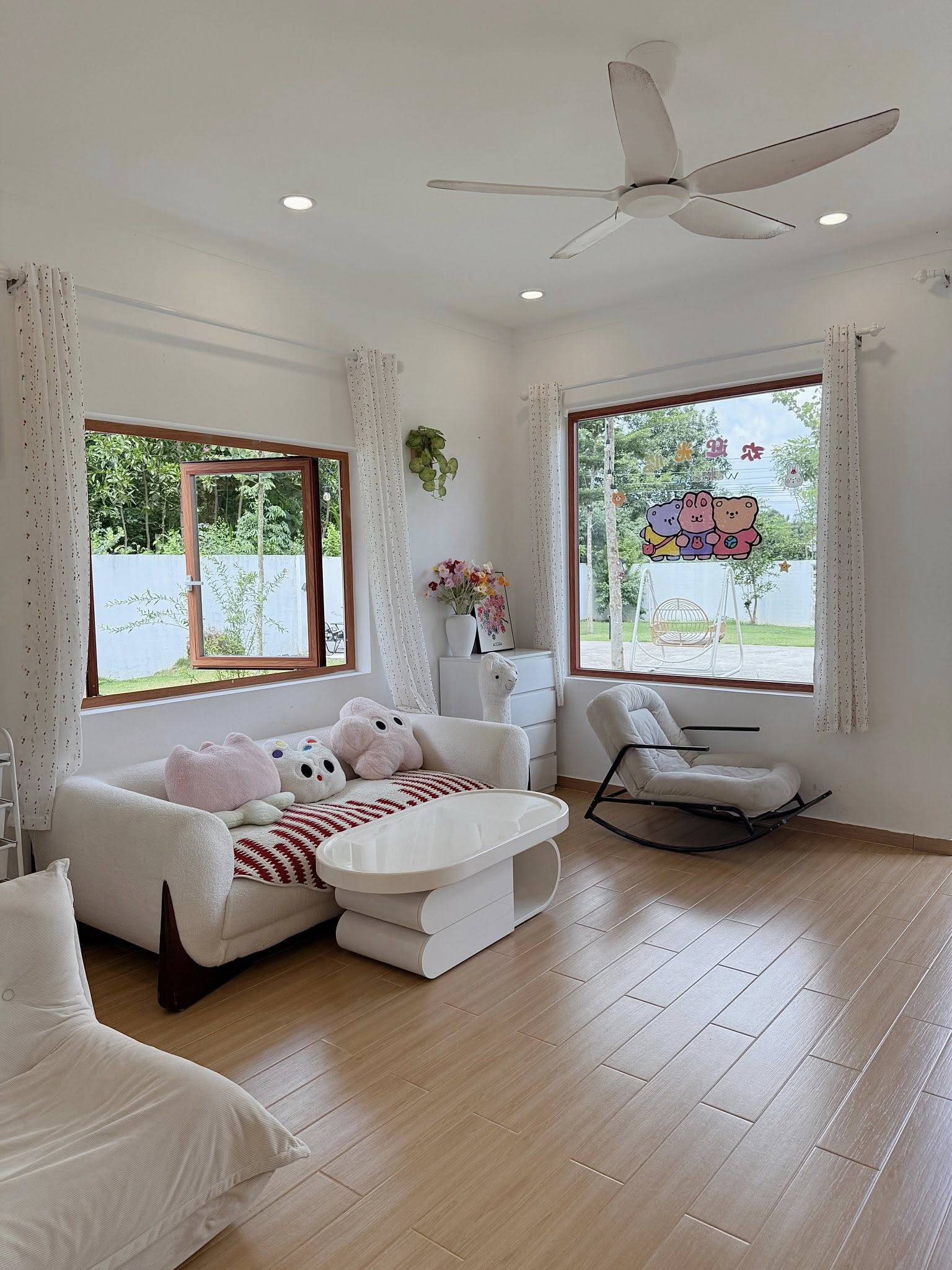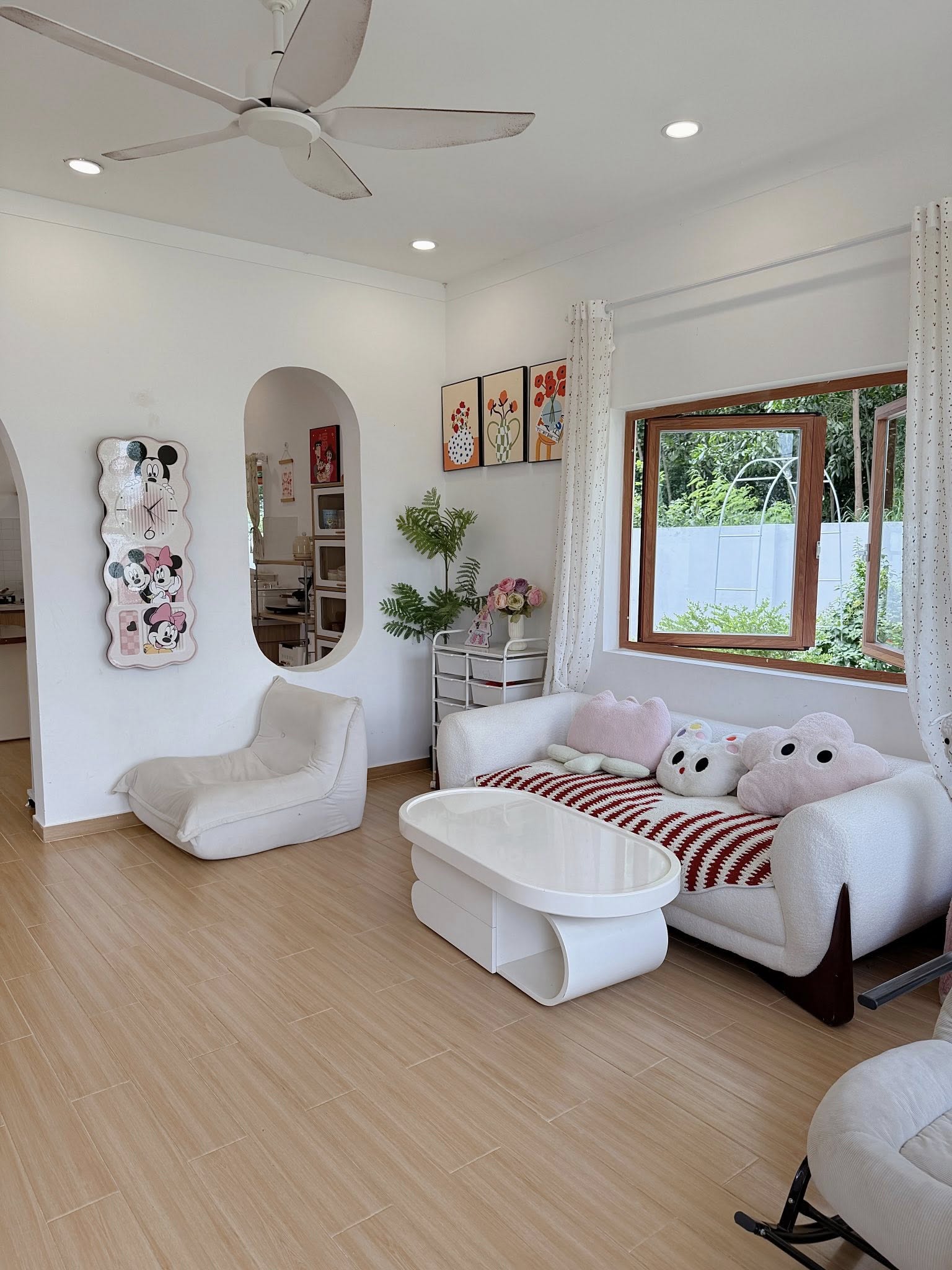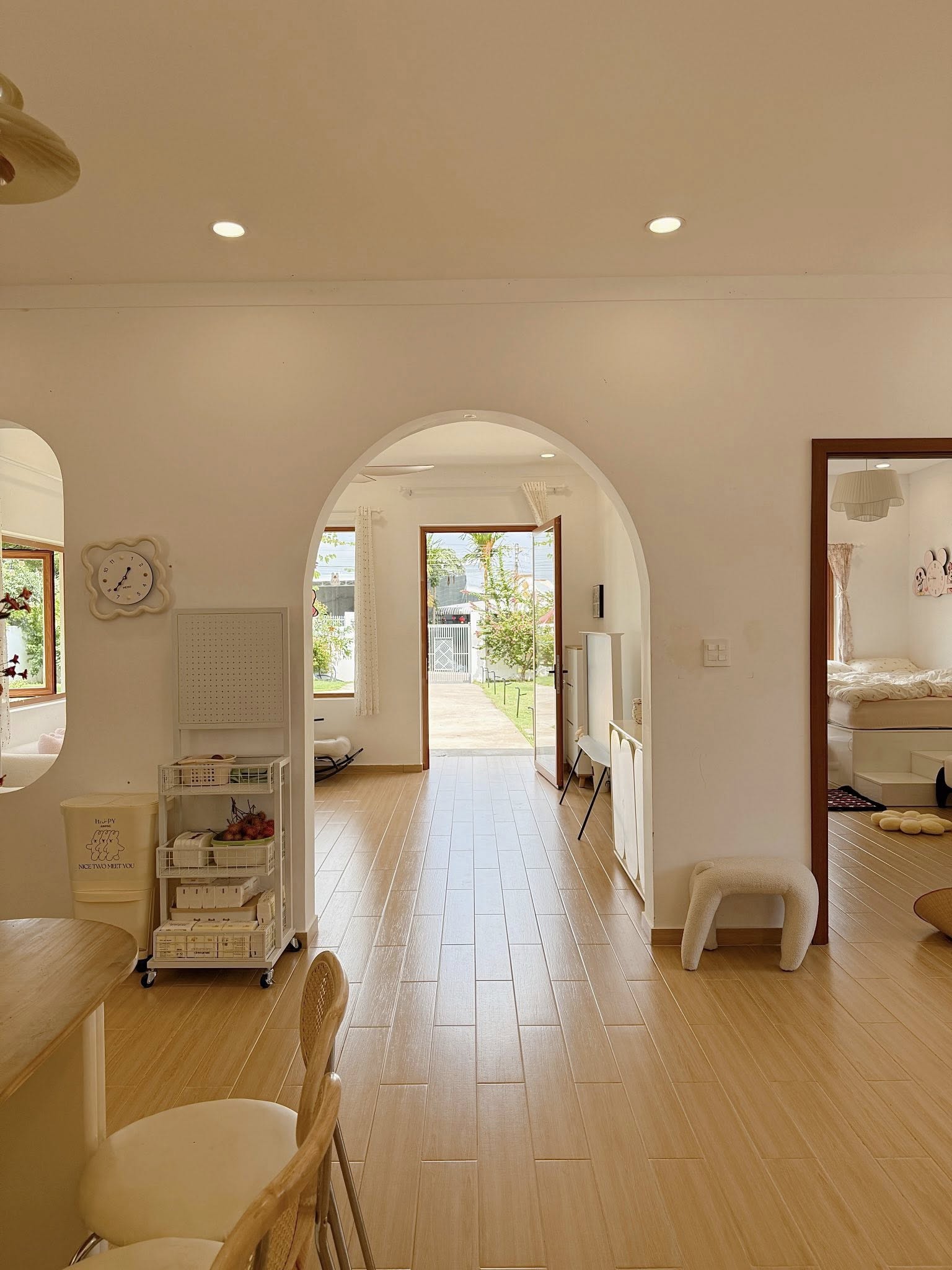 Bước vào nhà, mọi thứ được sắp xếp gọn gàng và tinh tế. Phòng khách, khu bếp và các góc sinh hoạt chung đều được decor nhẹ nhàng, mang gam màu sáng và ấm. Cô chọn nội thất đơn giản, nhưng tinh ý trong cách kết hợp chất liệu và ánh sáng. Một góc bập bênh bên cửa kính, tủ giày nhỏ xinh ngay lối vào, hay khung cửa sổ mở ra vườn… tất cả đều gợi cảm giác bình yên, thân thuộc.