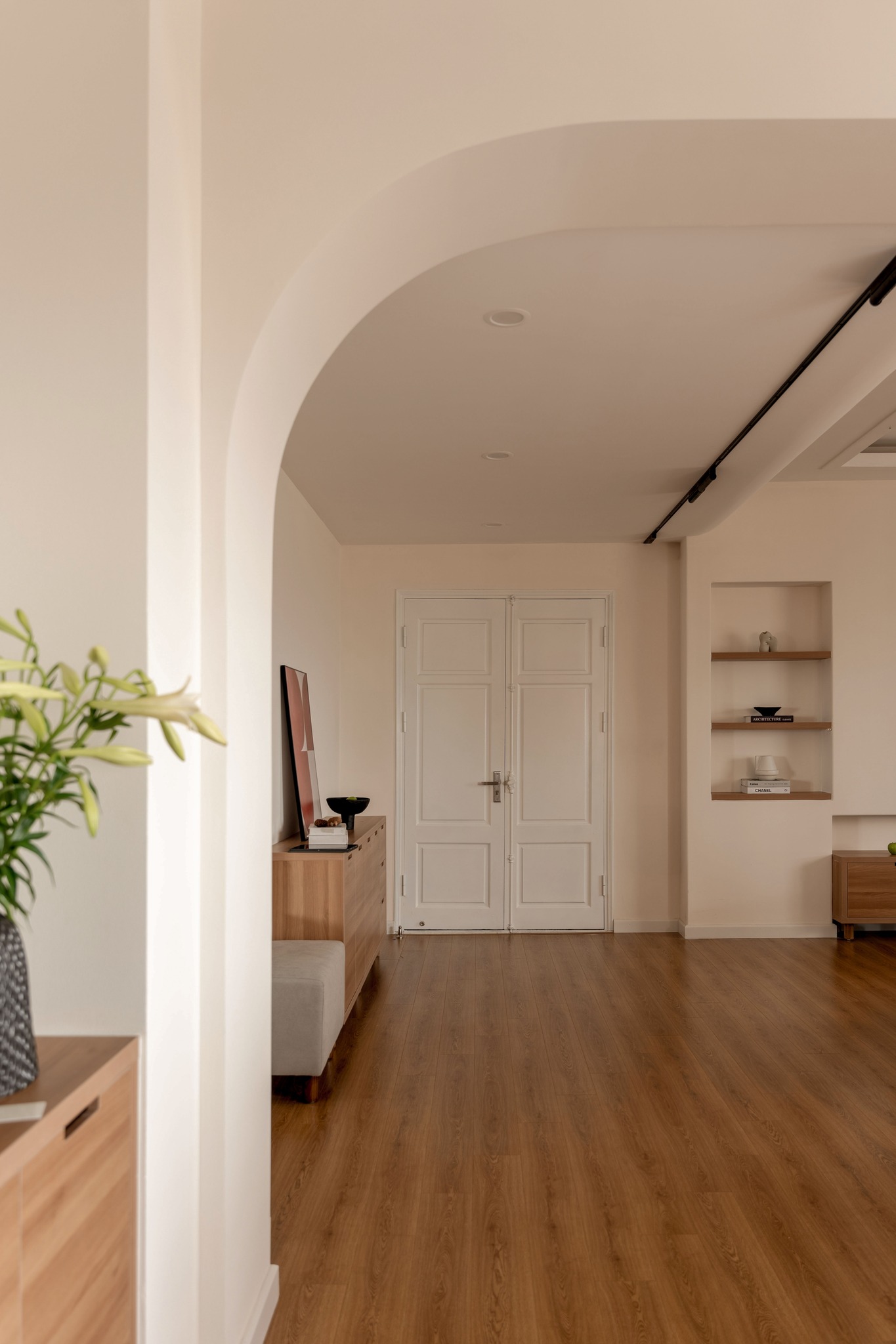 Căn hộ nổi bật với màu sắc trầm, nhã nhặn, kết hợp giữa tone trắng và gỗ tự nhiên.