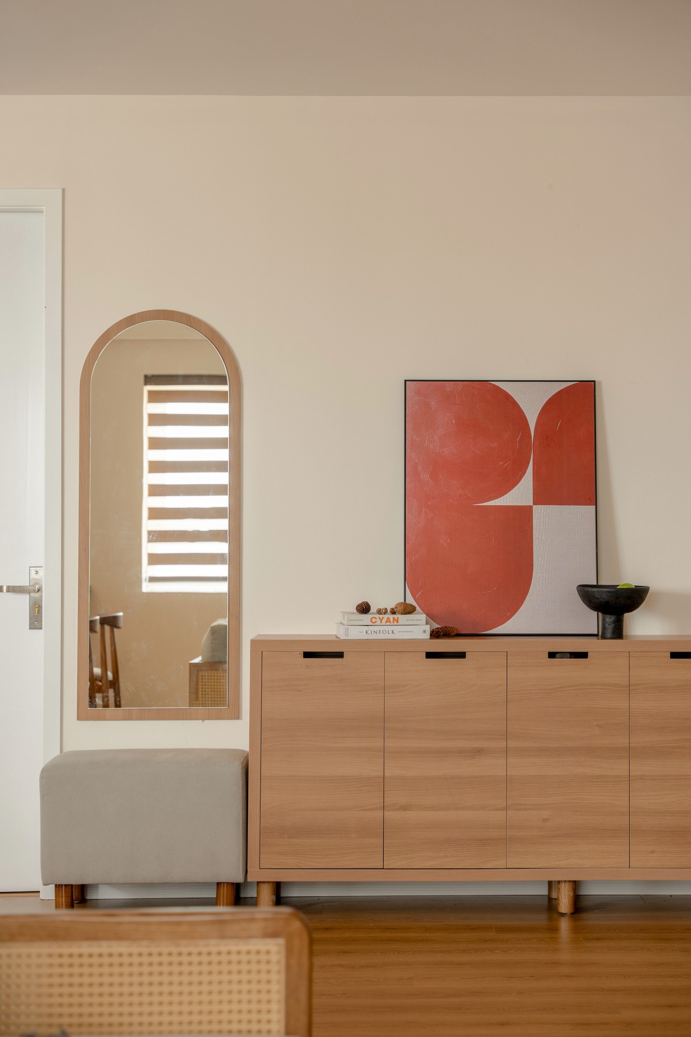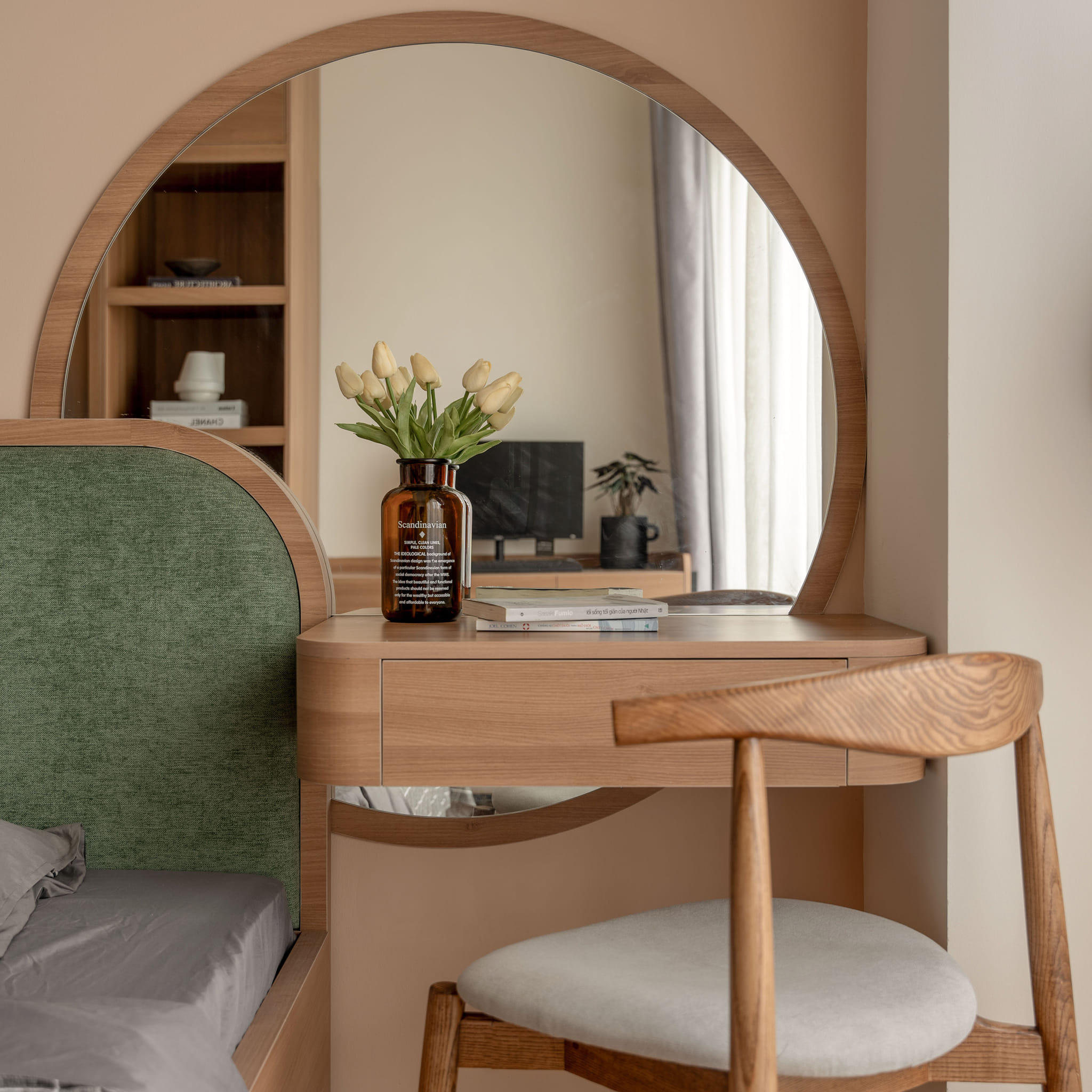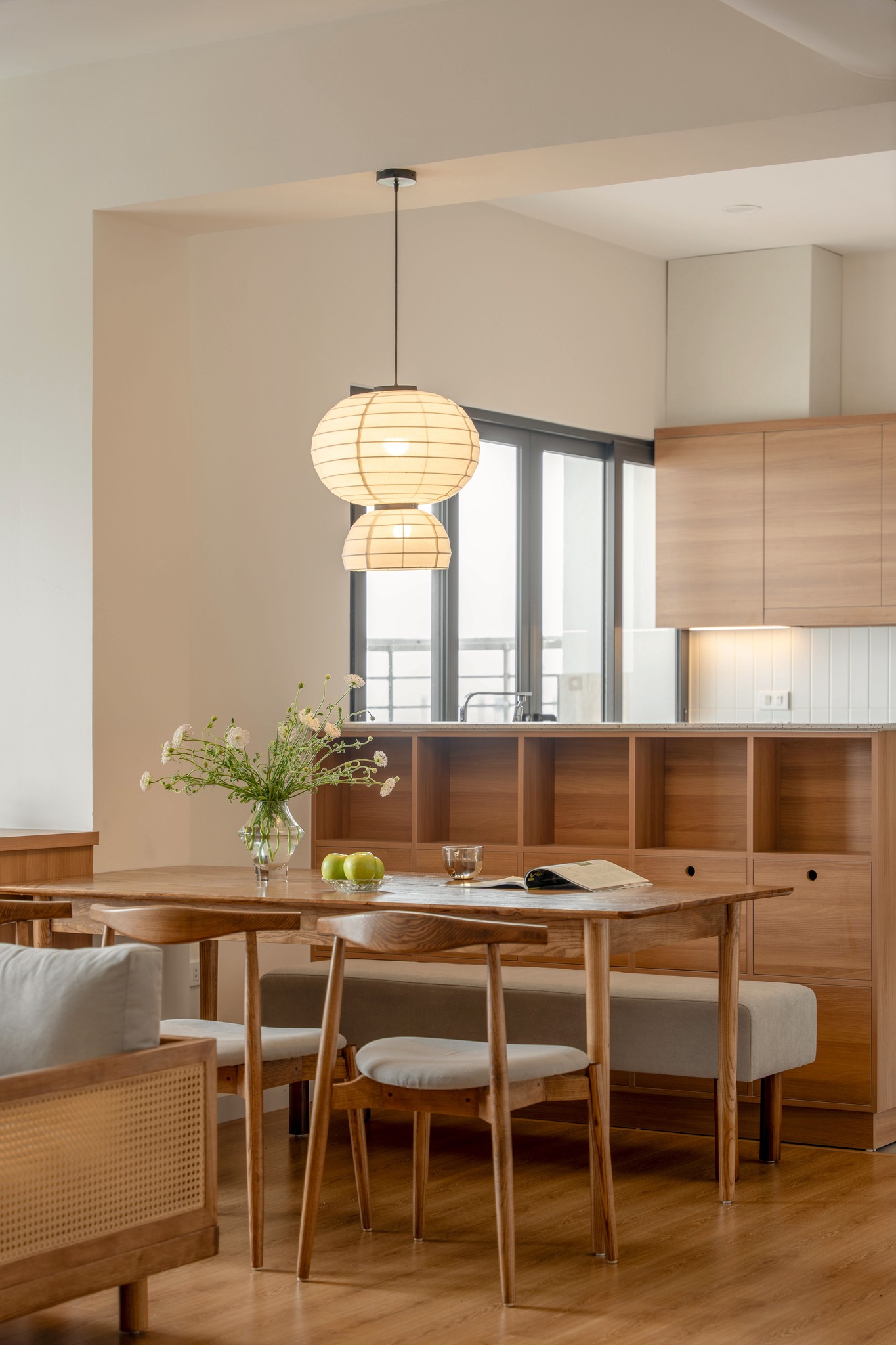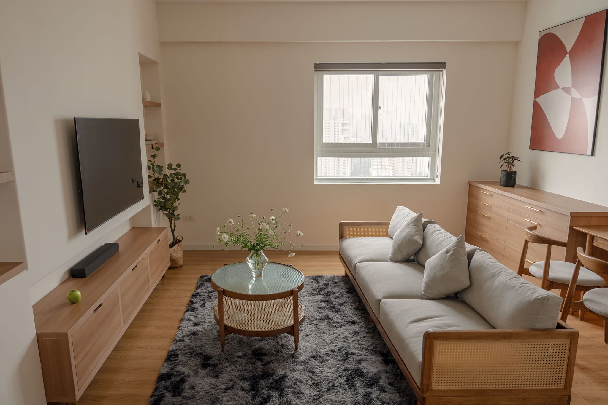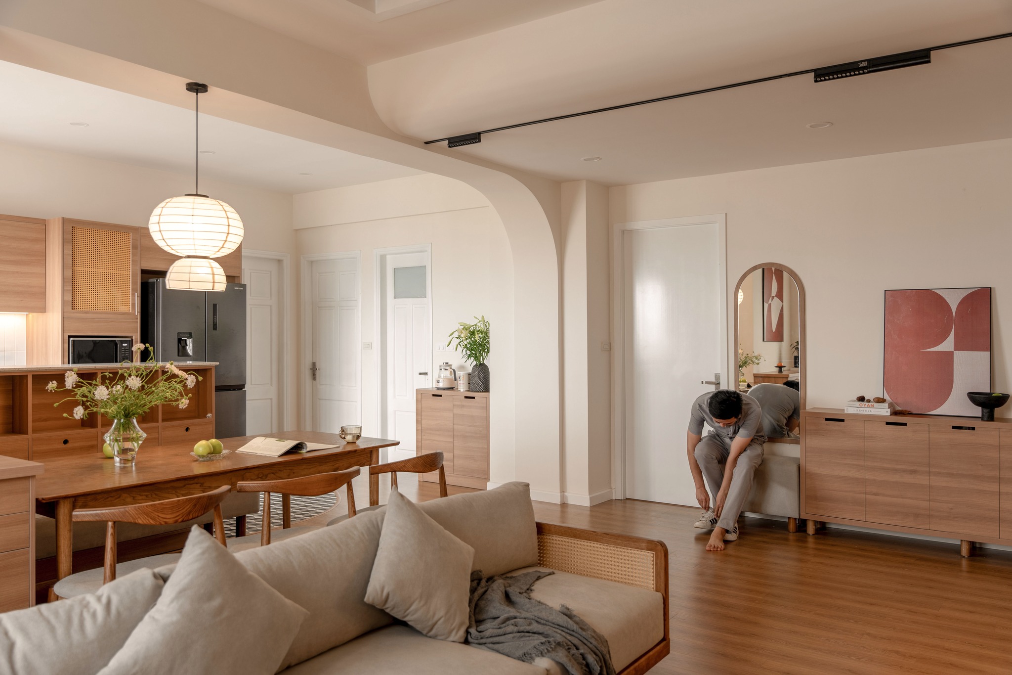 Đồ nội thất được thiết kế đơn giản, đa năng, dùng vật liệu tự nhiên, phù hợp với nhu cầu của các gia đình trẻ. Ngoài ra, giải pháp này cũng giúp giảm ngân sách đầu tư ban đầu và tiết kiệm phí bảo trì trong dài hạn. Căn hộ được thiết kế và thi công trong khoảng một tháng, chi phí cải tạo 300 triệu đồng.