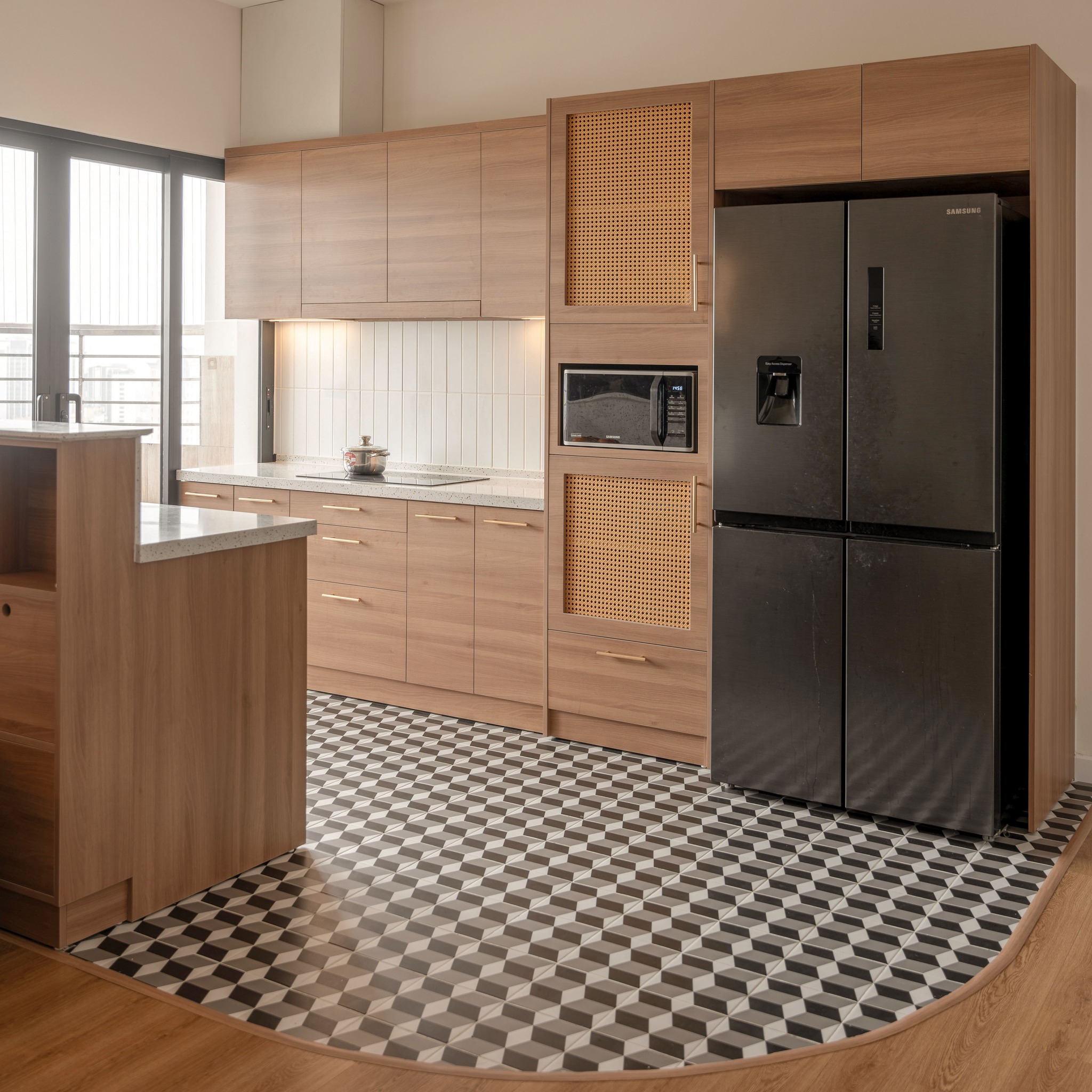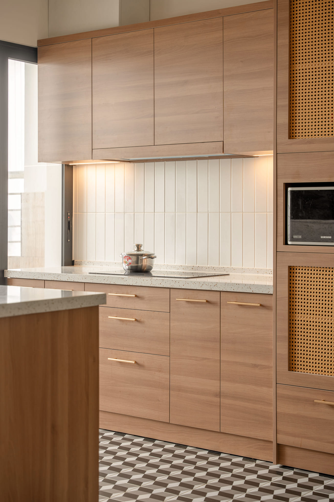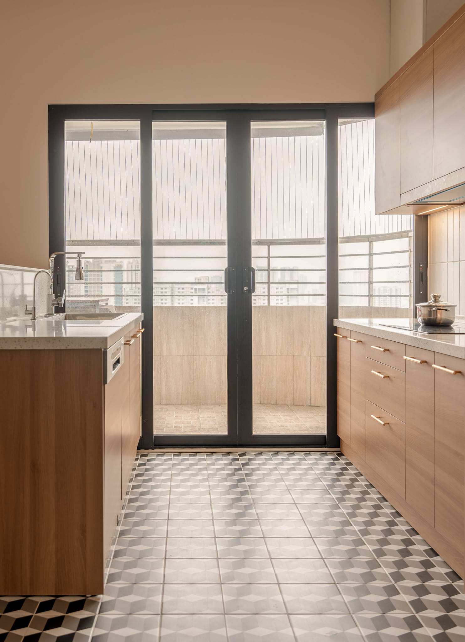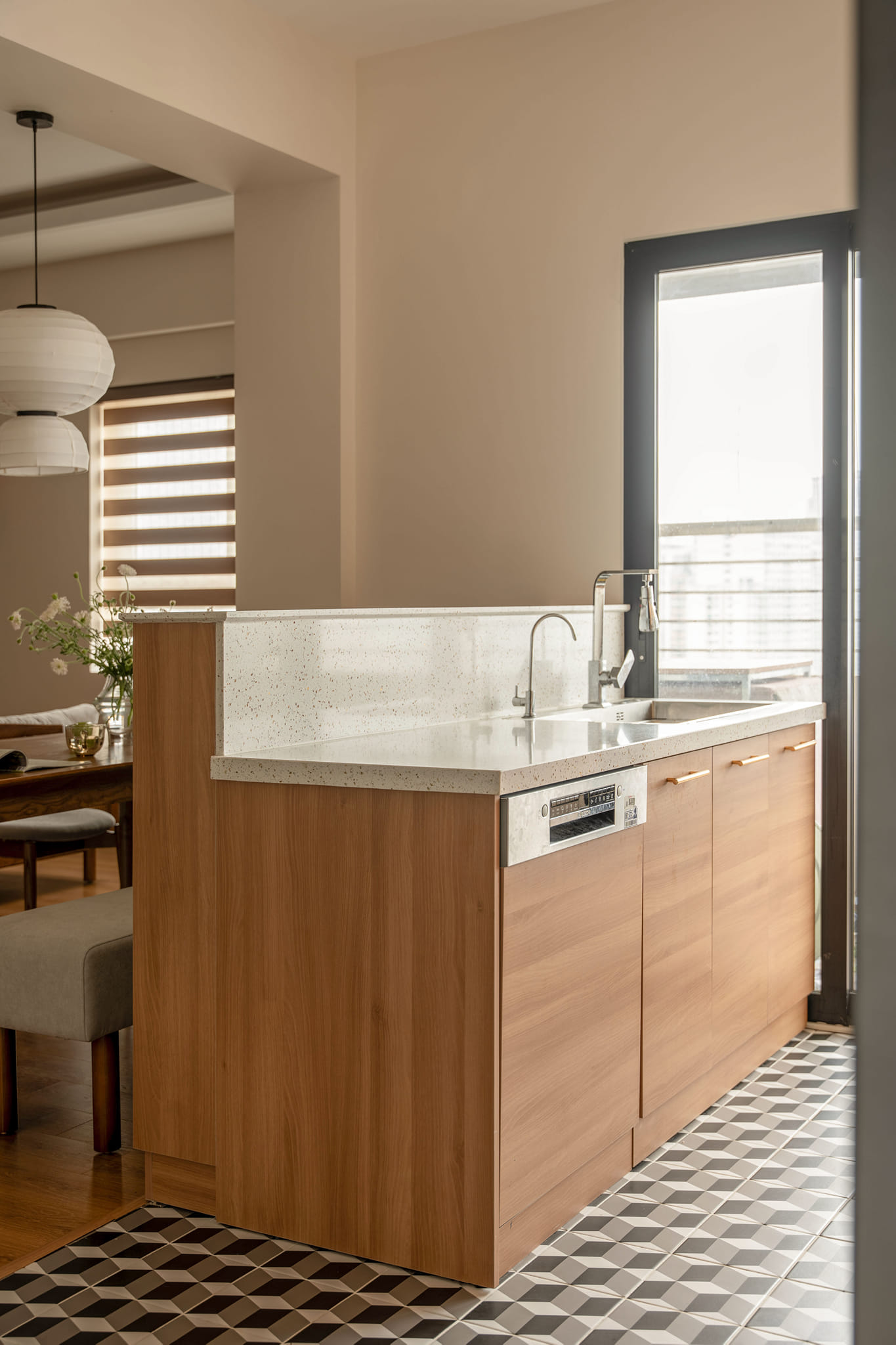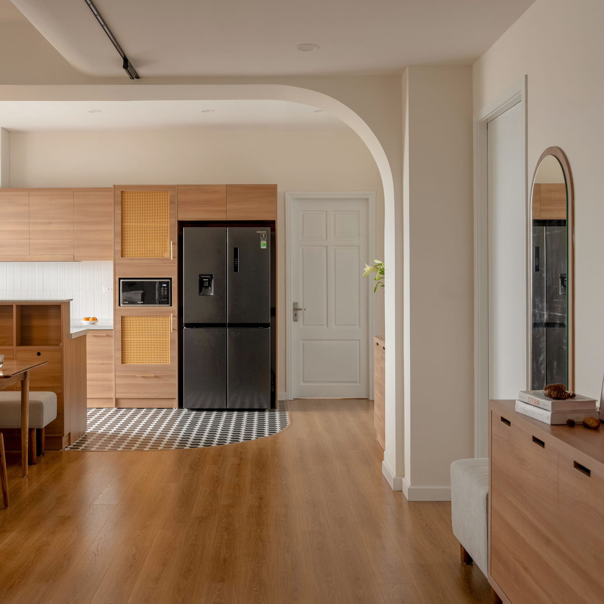 Khu bếp được ngăn cách với khu tiếp khách bởi sự khác biệt trong hệ sàn gỗ và gạch.