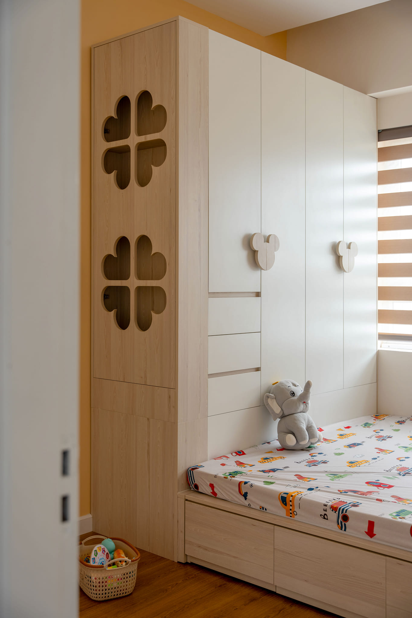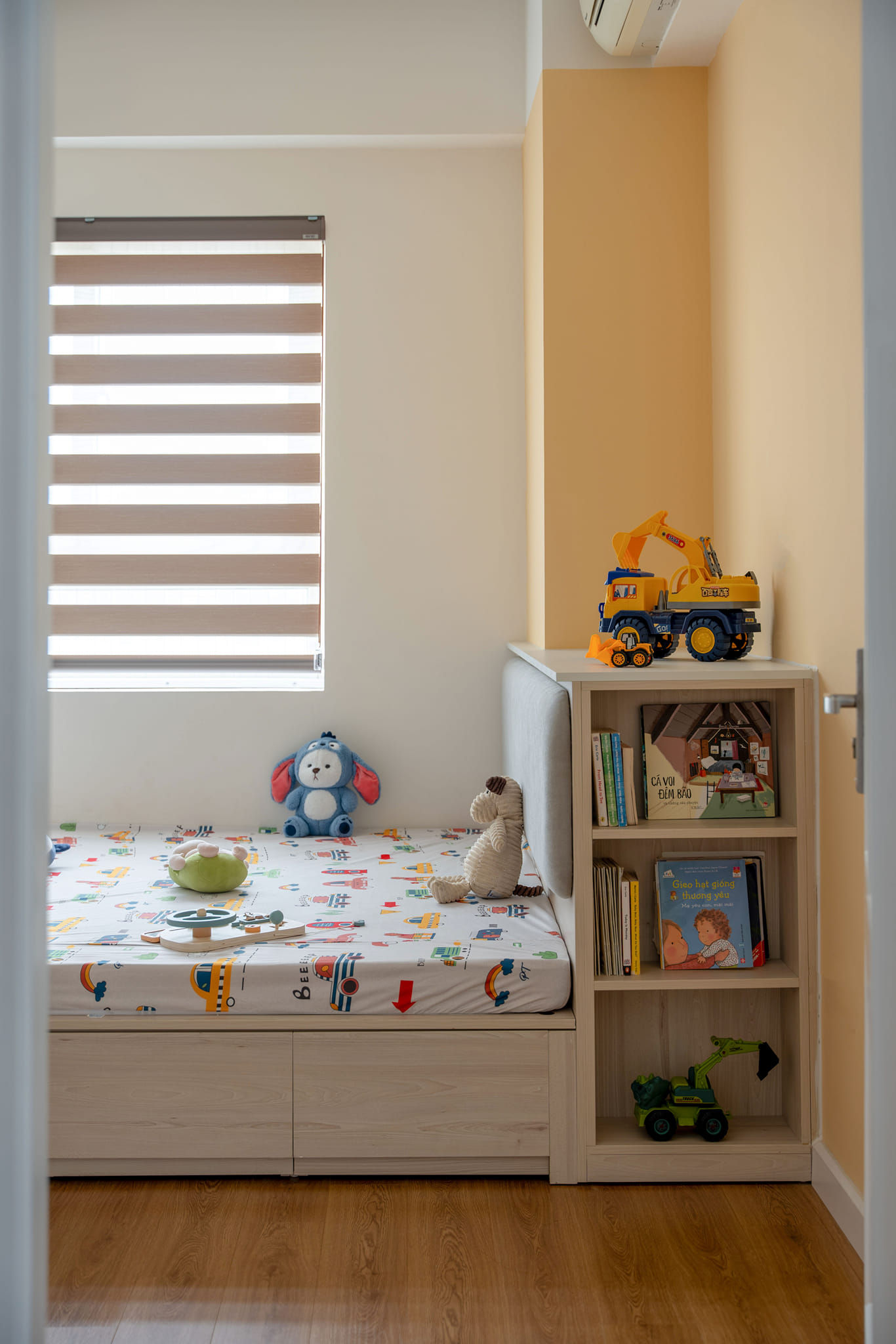 Phòng ngủ dành cho trẻ nhỏ được ưu tiên cách lấy sáng tự nhiên, kết hợp nội thất thông minh có khoang tủ rộng để tăng khả năng tích trữ đồ dùng.