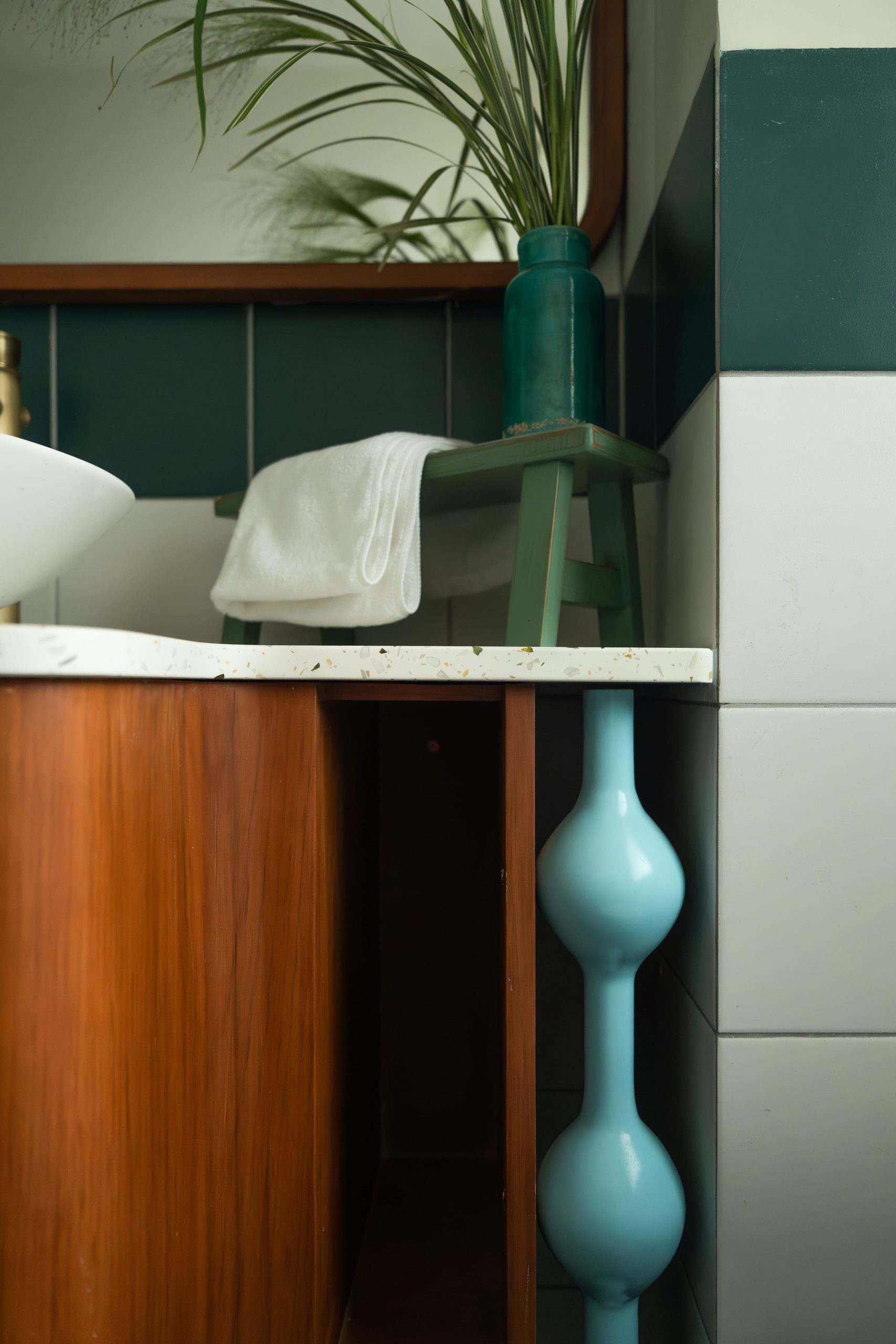Chi tiết chân tủ khối tròn màu xanh dương tạo điểm nhấn cho hệ lavabo.