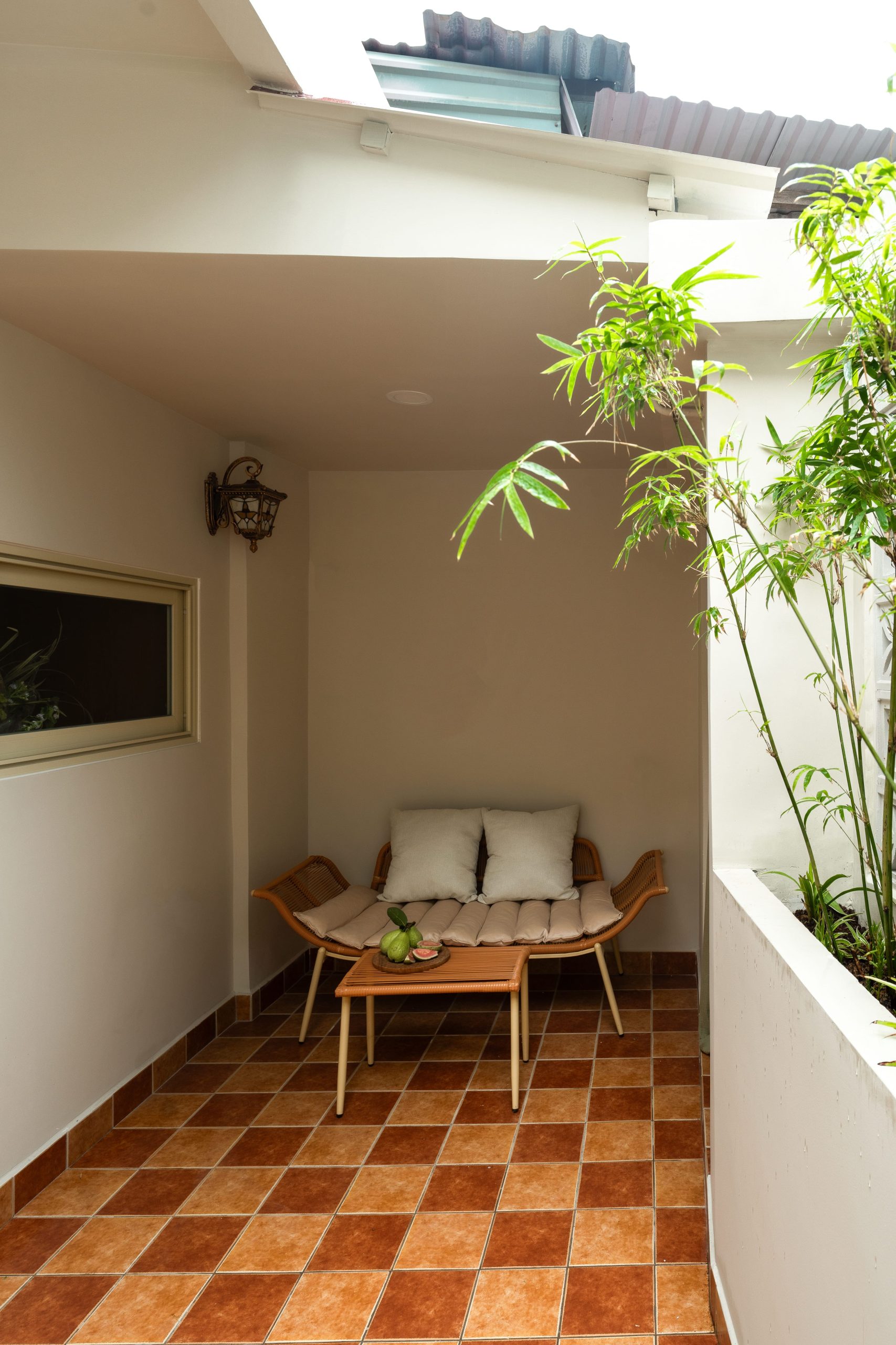 Bộ bàn ghế thư giãn đặt dưới mái che. Sau khi thông trần, từ khu vực này có thể phóng tầm mắt ra bên ngoài ngắm nhìn những tòa nhà cao tầng giữa trung tâm Quận 1, như một cách tương tác giữa công trình với bối cảnh xung quanh.