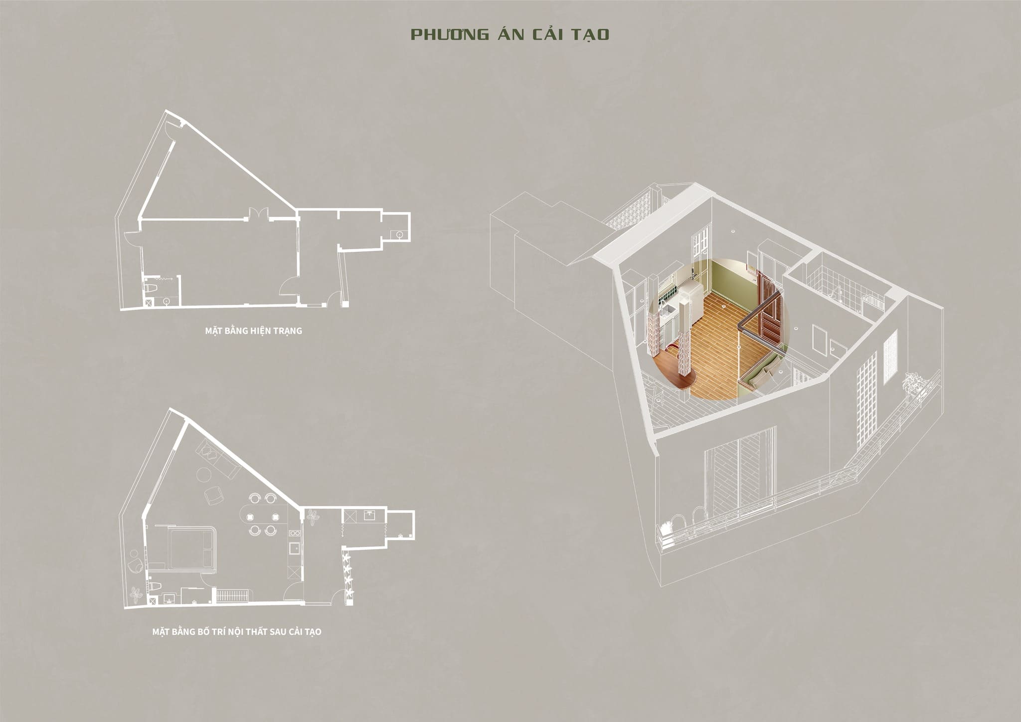 Căn hộ ban đầu xây dựng với không gian khép kín, ít ánh sáng tự nhiên, phân khu và điện nước vẫn còn hạn chế về mặt công năng, một số vật liệu có dấu hiệu cũ kĩ theo thời gian như trần nhà mái tôn rỉ sét, hệ thống dây điện đi nổi không có tính sắp xếp. Để bố trí lại mặt bằng, mảng tường ngăn cách phòng ngủ hiện trạng đã được phá bỏ giúp cho không gian có tính kết nối liền mạch, thoáng đãng. Nhà vệ sinh mở rộng và thay đổi cửa vào đê đáp ứng nhu cầu tiện nghi mới. Nhóm thiết kế tiếp cận ánh sáng tự nhiên qua vật liệu gạch lấy sáng, mở thêm cửa sổ, tháo dỡ mái tôn trần kín.