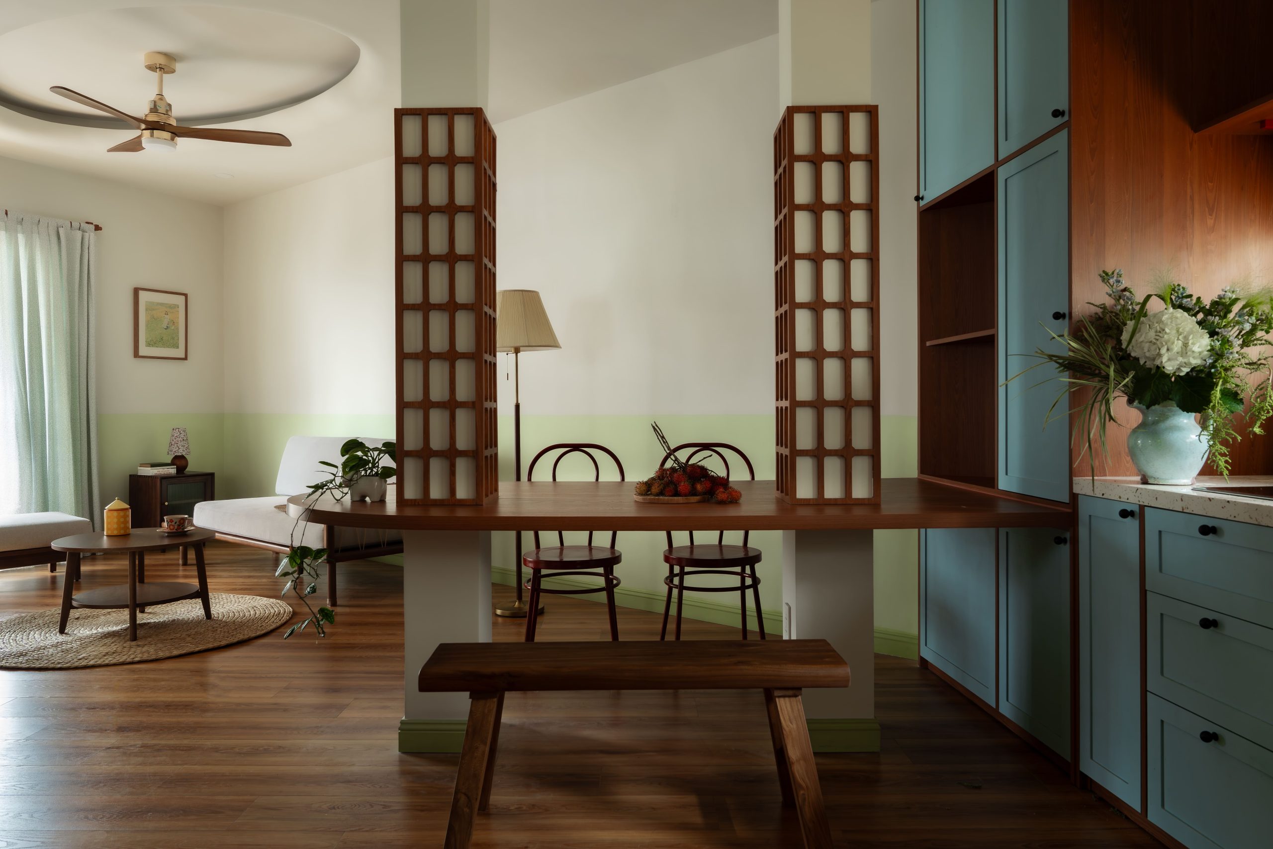 Sau khi phá bỏ bức tường dài ở giữa nhà, hiện trạng để lộ 2 cột chịu lực, vốn để đỡ hệ xà gồ gỗ ốp mái tôn phía trên. IIN studio đã biến nhược điểm này thành điểm nhấn lạ mắt, khoác chiếc áo trang trí mới với chi tiết chữ nhật tối giản, cùng chiếc bàn bo góc tròn lơ lửng gắn liền với khối bếp, vừa là bàn ăn, vừa là bàn làm việc.