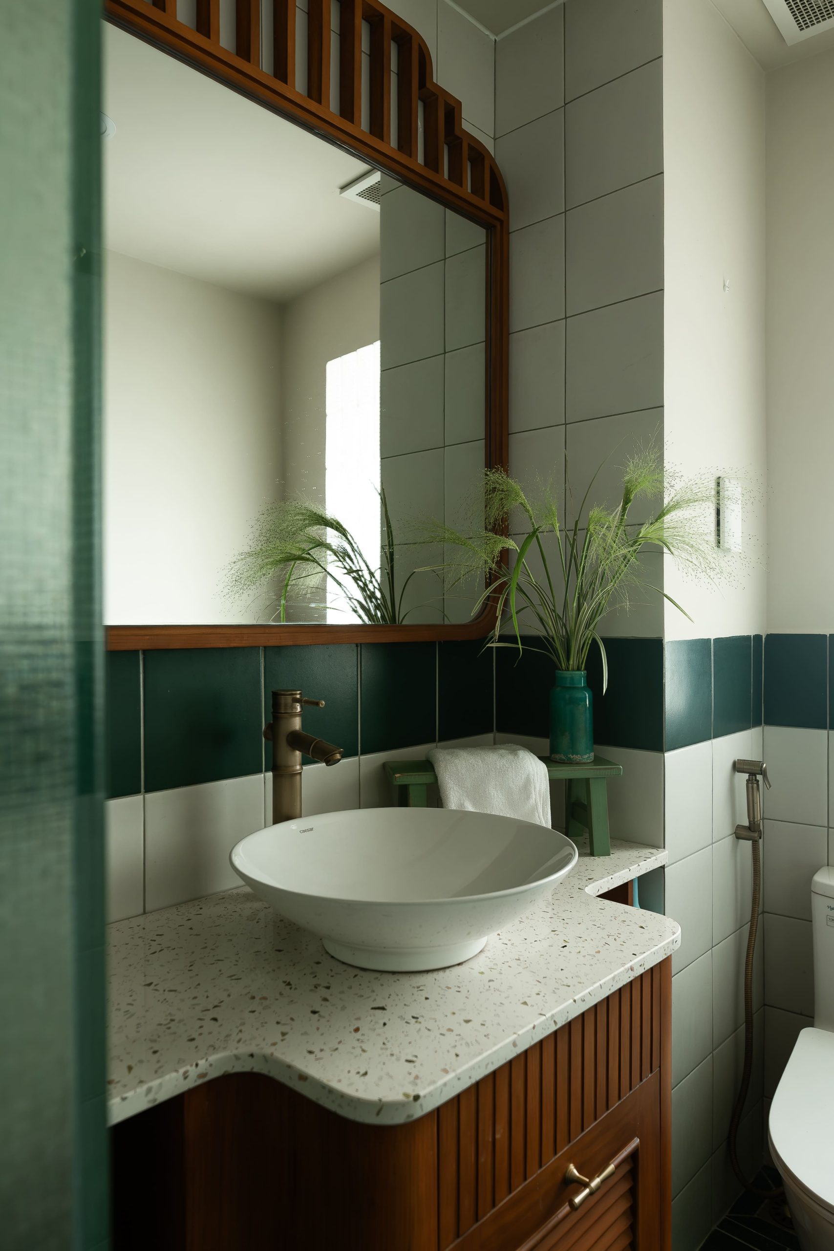 Vật liệu nhà vệ sinh được thay đổi mới với mặt đá terrazzo hiện đại, gương và hệ tủ lavabo gỗ tự nhiên tối màu chi tiết song dọc, vòi rửa bằng đồng hình ống trúc mang yếu tố Á Đông.