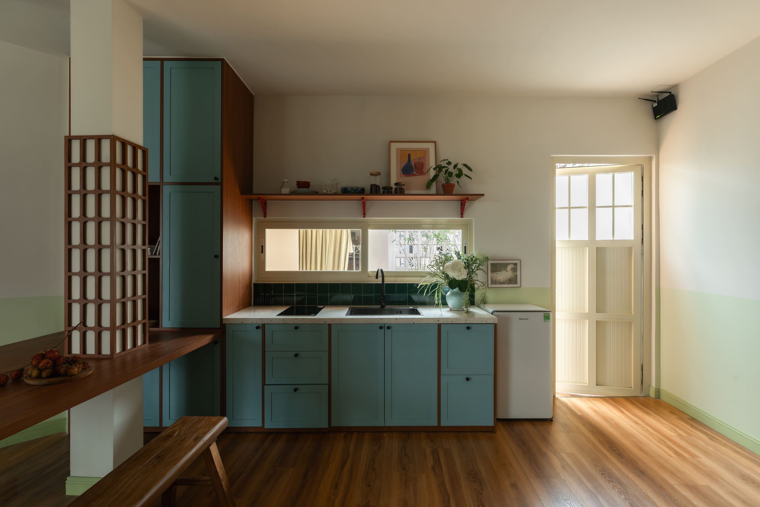 Khu vực bếp được di dời ra hướng sân trước, gần cửa ra vào. Cửa sổ kính lùa chạy dọc theo chiều dài mặt bếp, nhìn ra không gian bên ngoài, giúp lấy sáng và thoát mùi khi nấu ăn. Màu xanh dương, xanh lá, vàng mỡ gà và điểm đỏ, làm cho căn bếp trở nên thú vị và tươi vui.