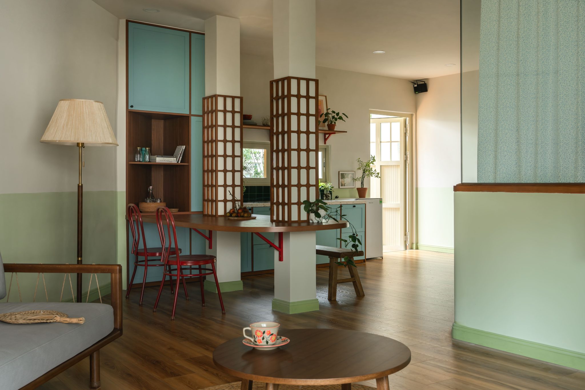 Phòng ngủ sử dụng hệ kính lửng, che rèm linen đóng mở linh hoạt, cửa lùa tiết kiệm không gian, ngôn ngữ thiết kế trên khung cửa được đồng bộ với hoạ tiết trên cột bếp.