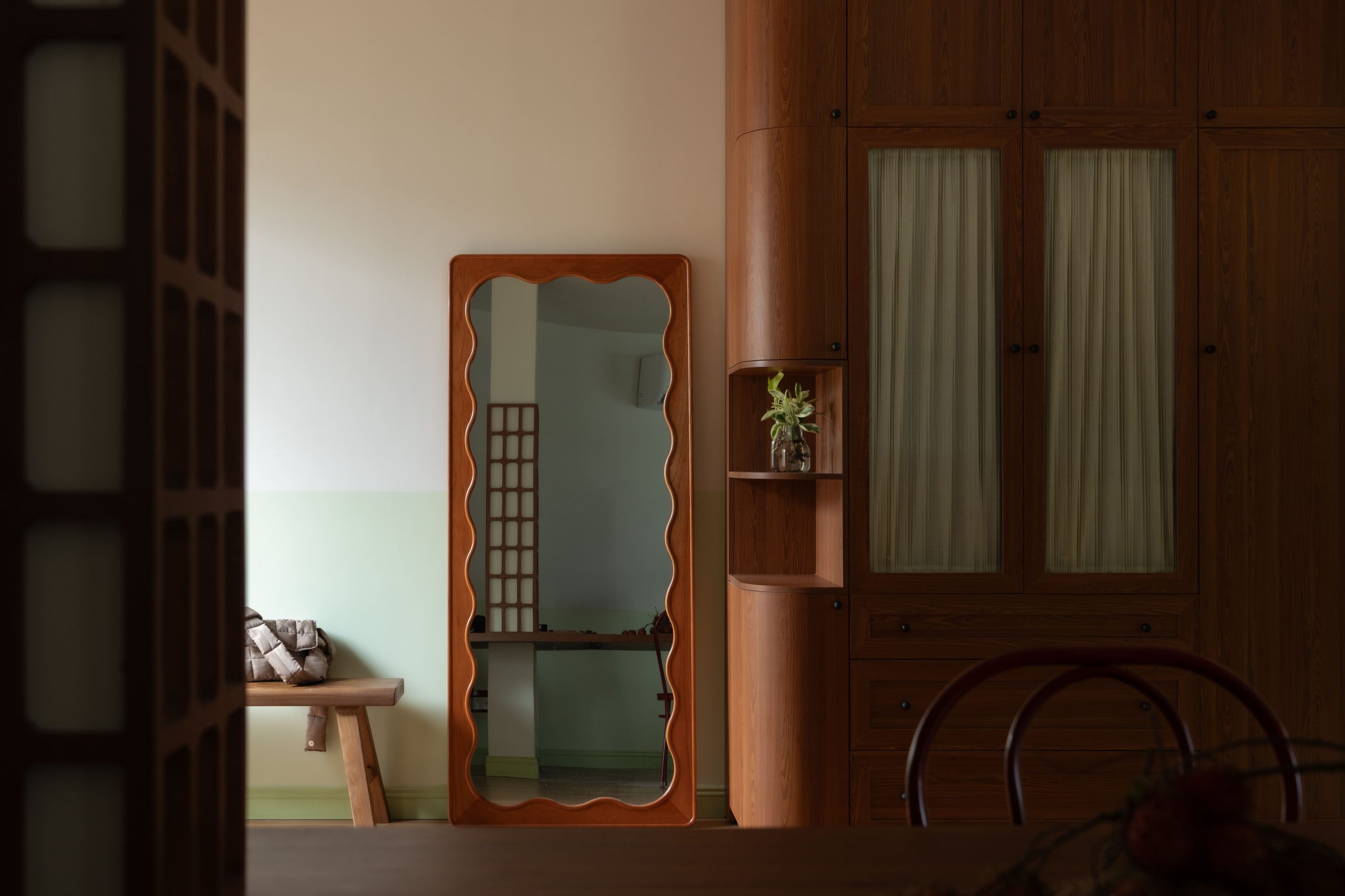 Tủ quần áo bố trí trước nhà vệ sinh. Tấm rèm bên trong khung kính và chi tiết góc tủ tròn tăng tính mềm mại . Gương và ghế dài đặt dọc trục lối ra vào và nhà vệ sinh.
