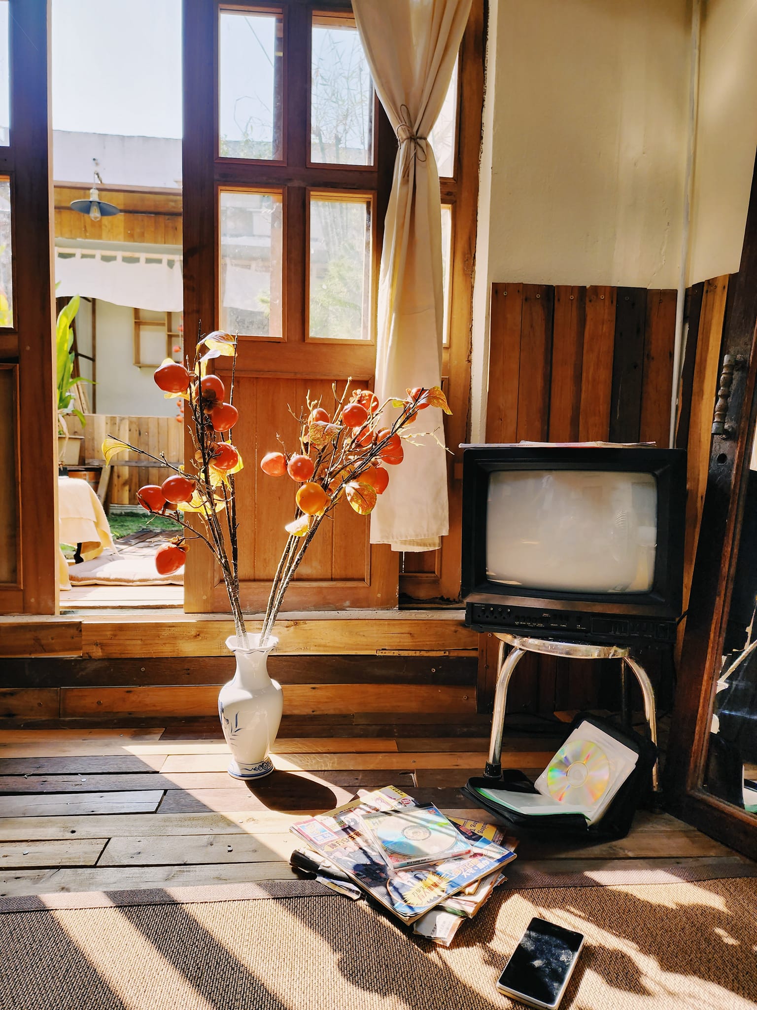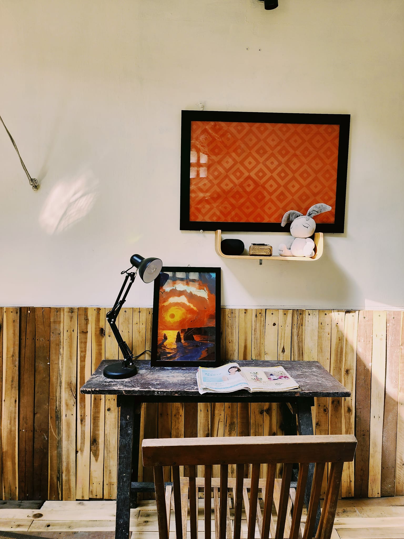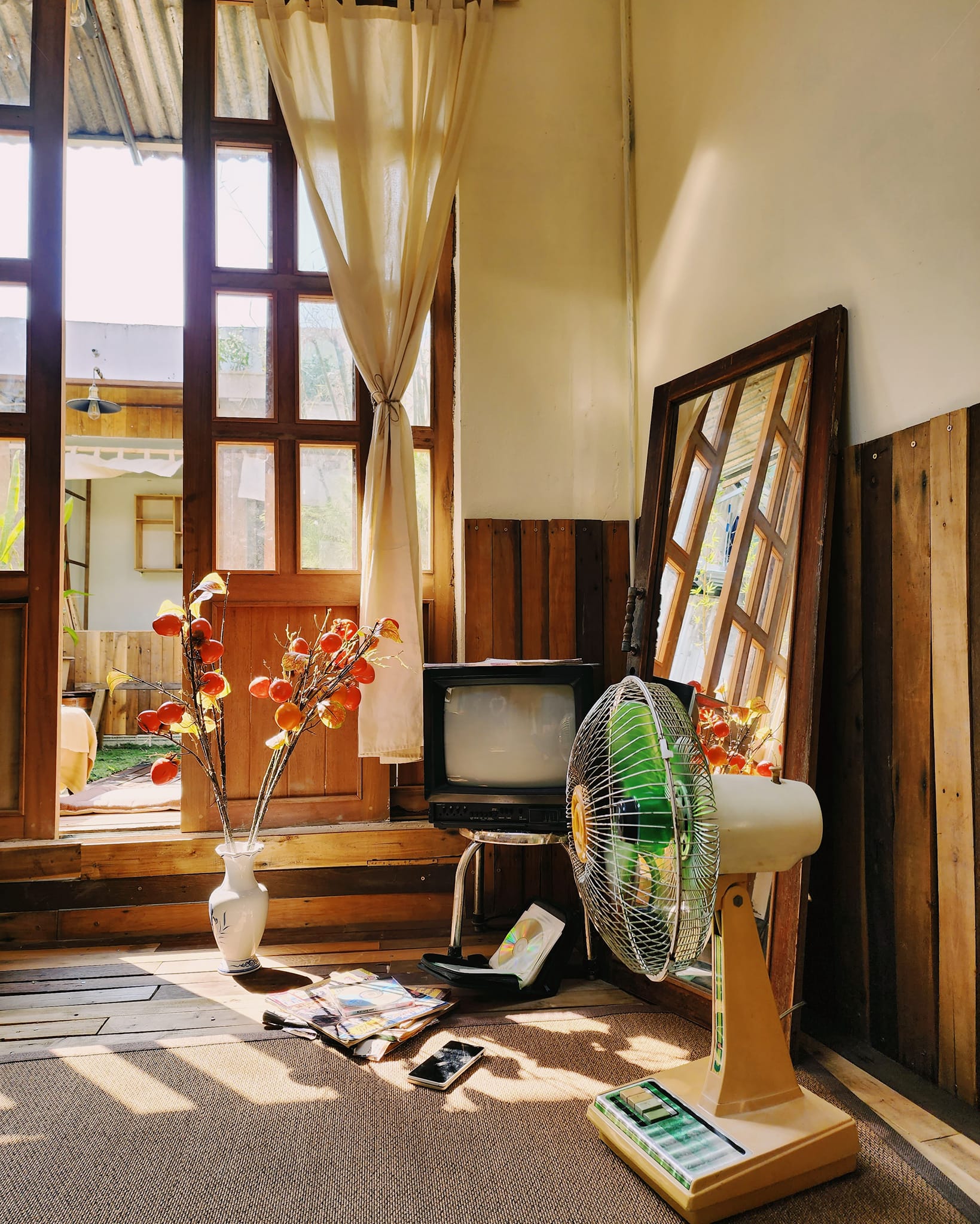 Sàn nhà ốp gỗ thông mài nhẵn, đồ cũ được chủ nhân săn lùng ở khắp nơi. Phần gỗ ốp tường cũng là gỗ pallet.