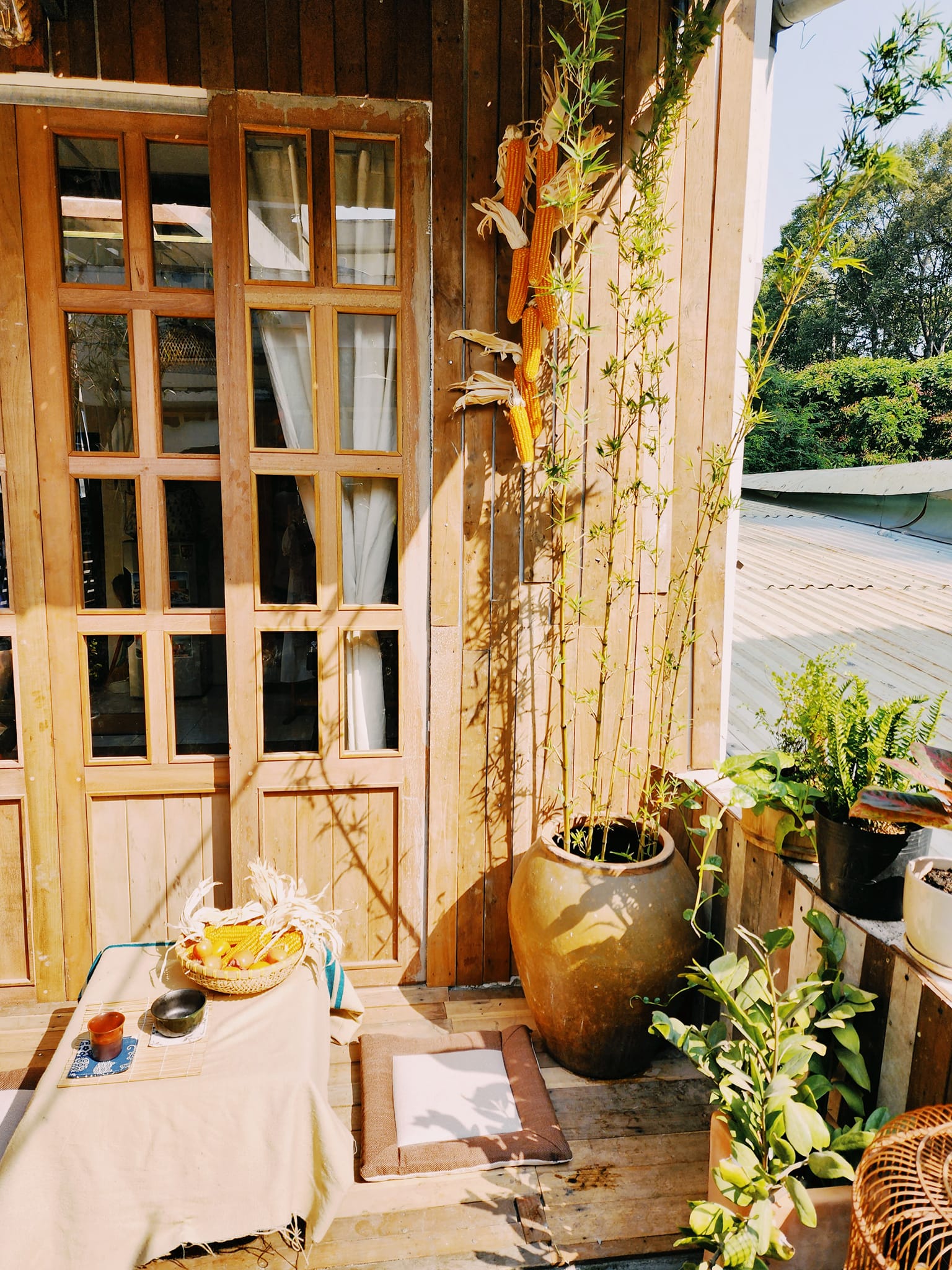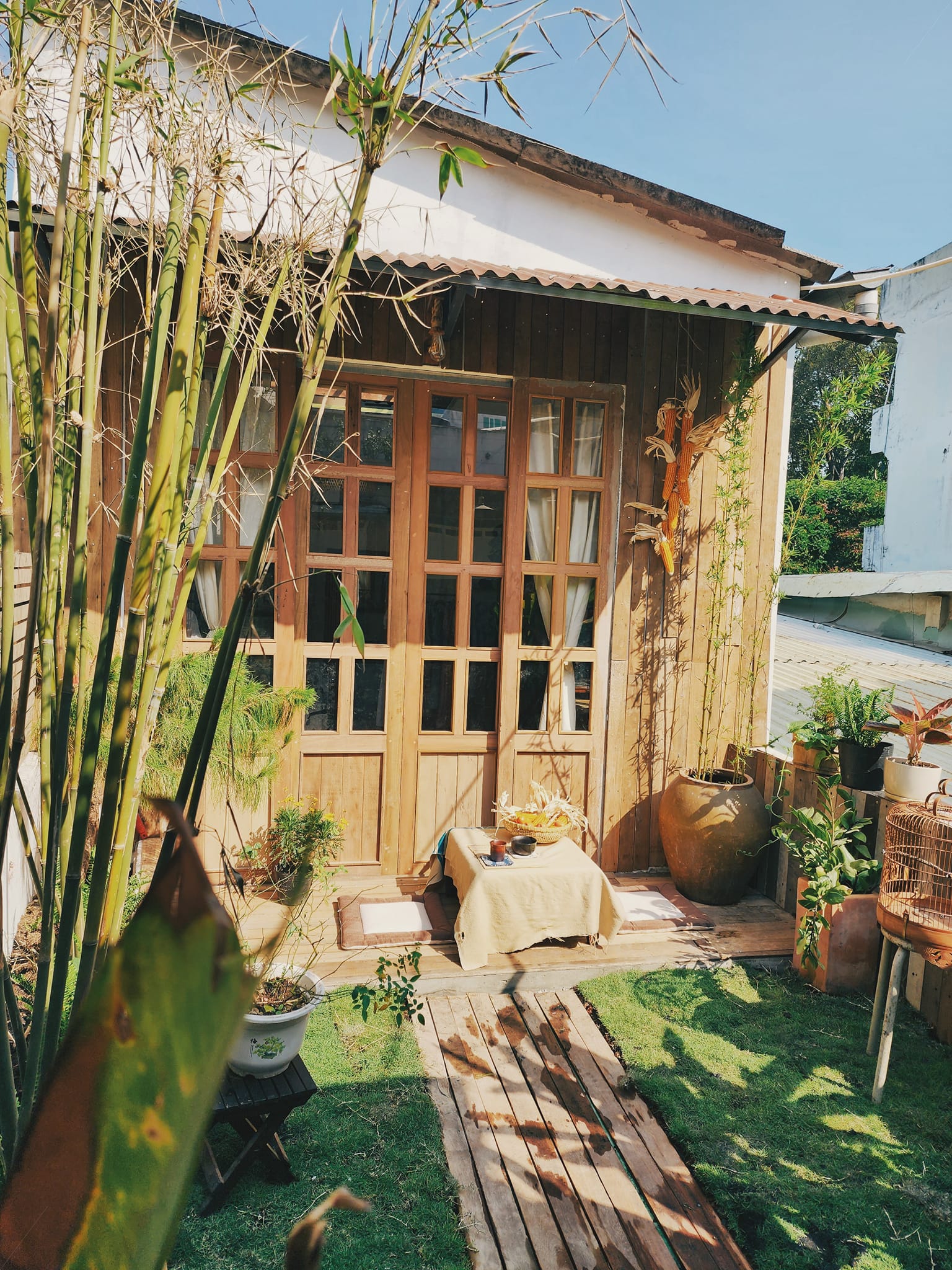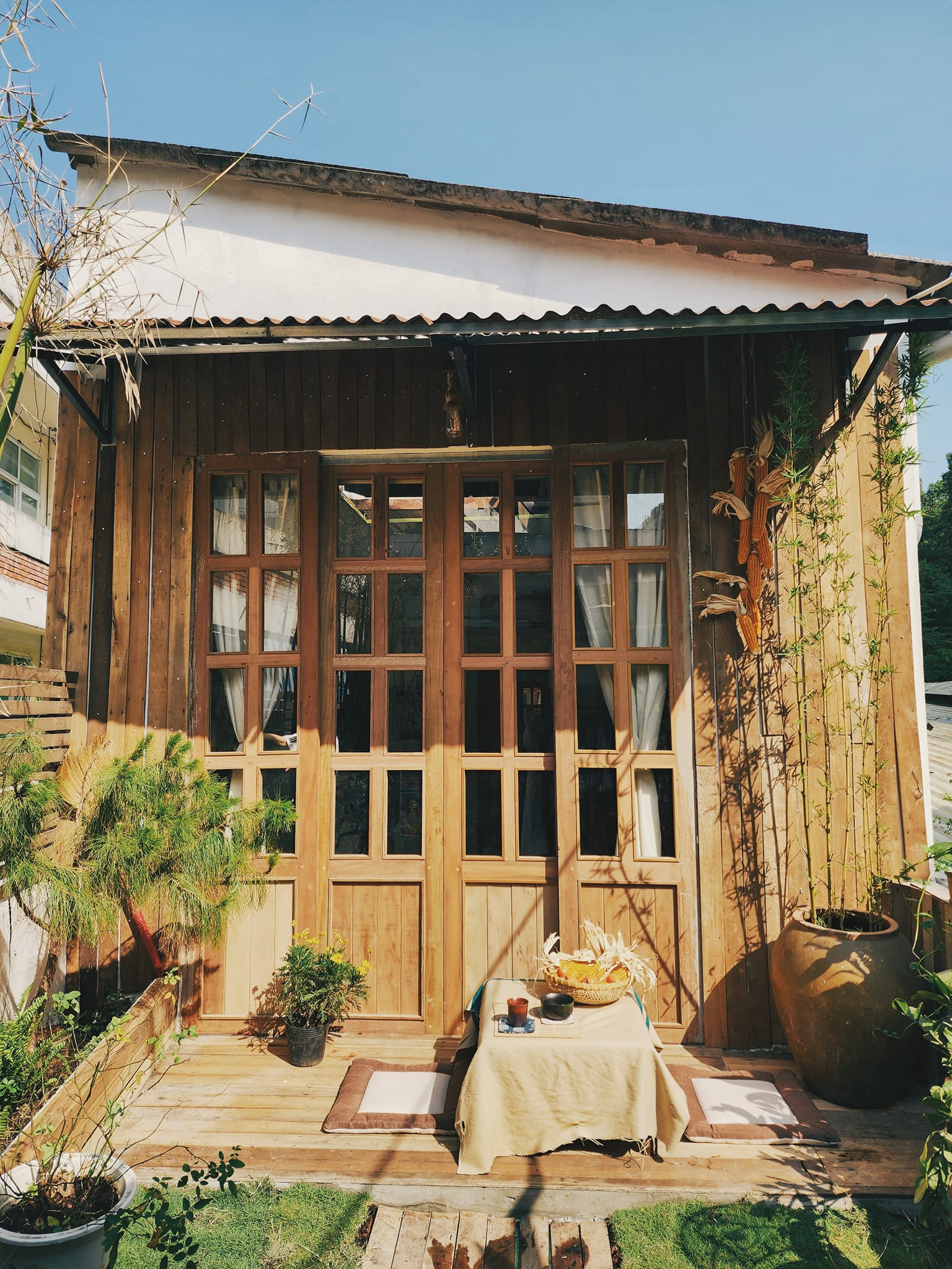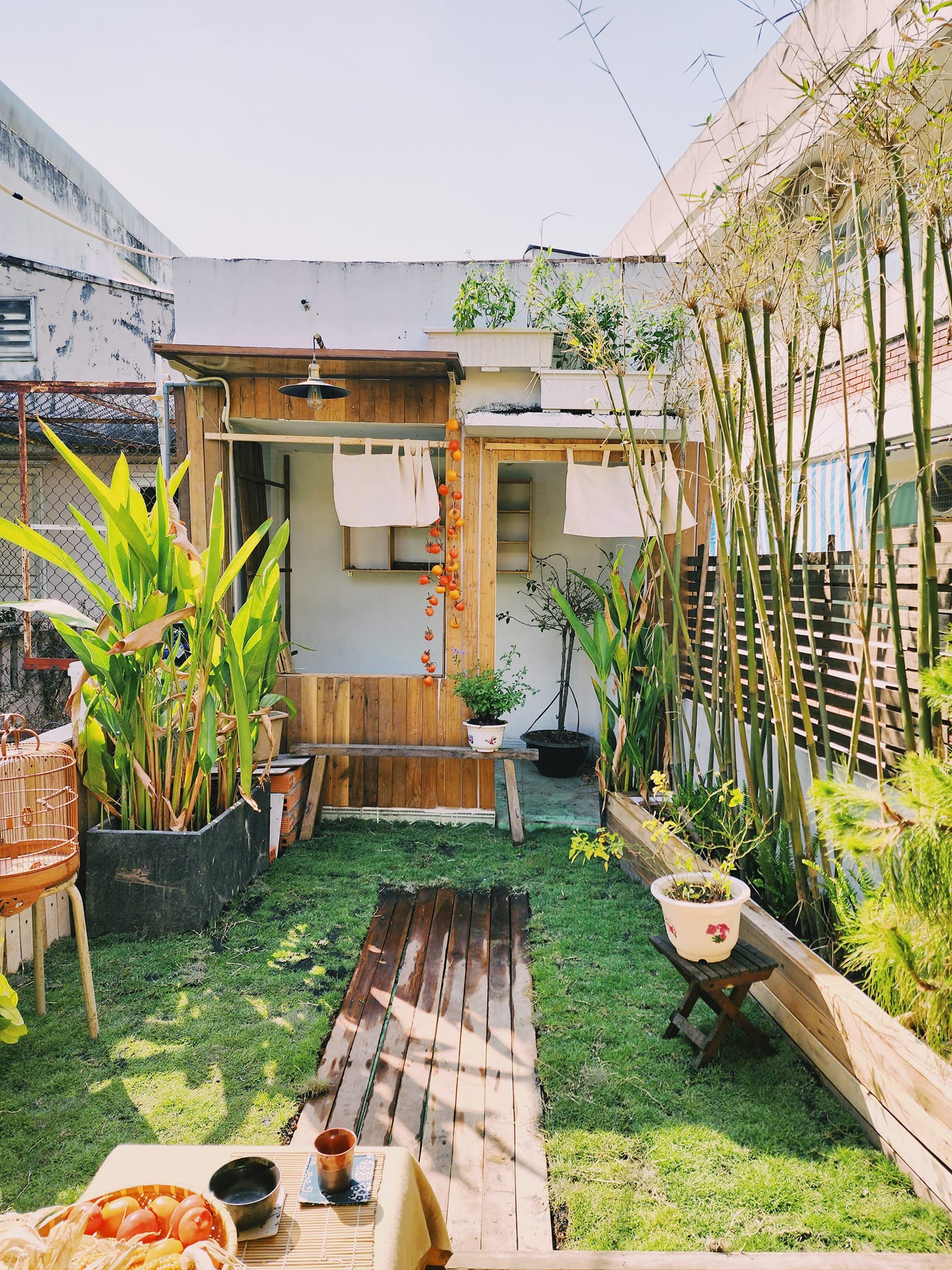 Sân thượng 45m2 cũ nát được anh Thái Thức thuê thợ đập đi xây lại, lợp mái tôn và ốp gỗ giống những ngôi nhà ở thành phố Đà Lạt.
