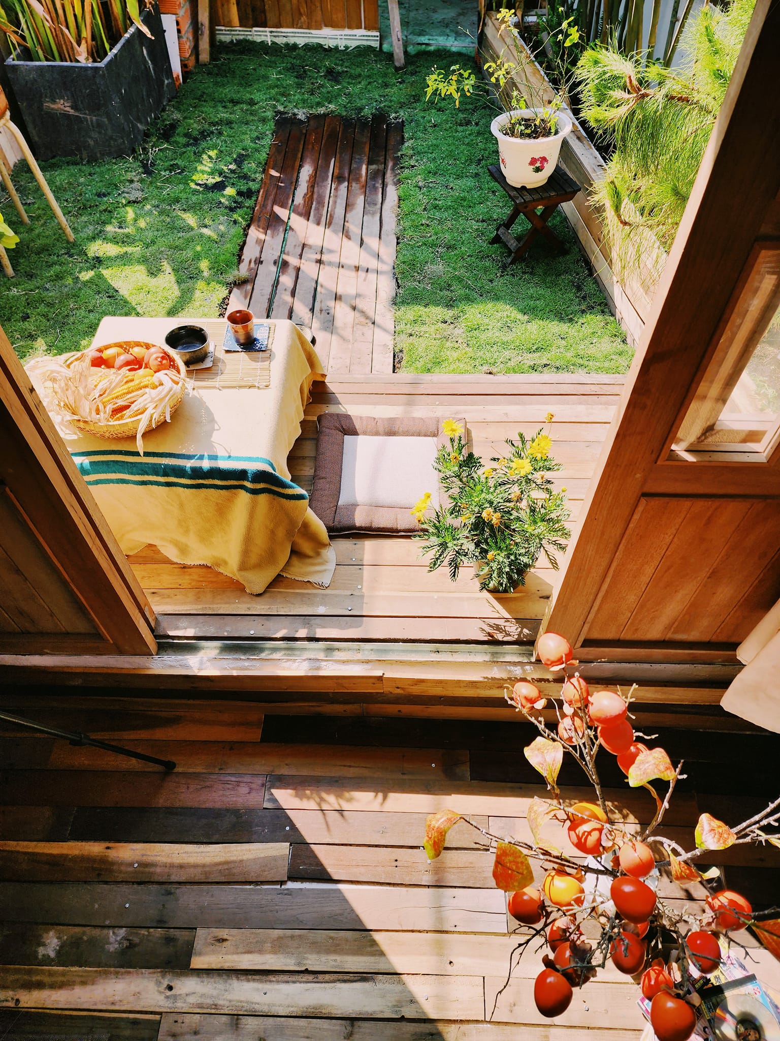 Do nằm trên sân thượng, vấn đề thời tiết sẽ ảnh hưởng đến độ bền của vật liệu gỗ, vì vậy những kết cấu chính anh chọn gỗ dầu – loại vật liệu thích ứng được với khí hậu mưa, nắng. Những khu vực khác anh dùng gỗ pallet đóng và muốn để nguyên sự mộc mạc, sờn cũ, để gỗ lên rêu một chút cho xưa cũ.