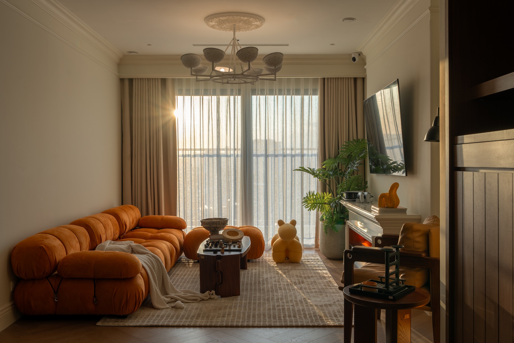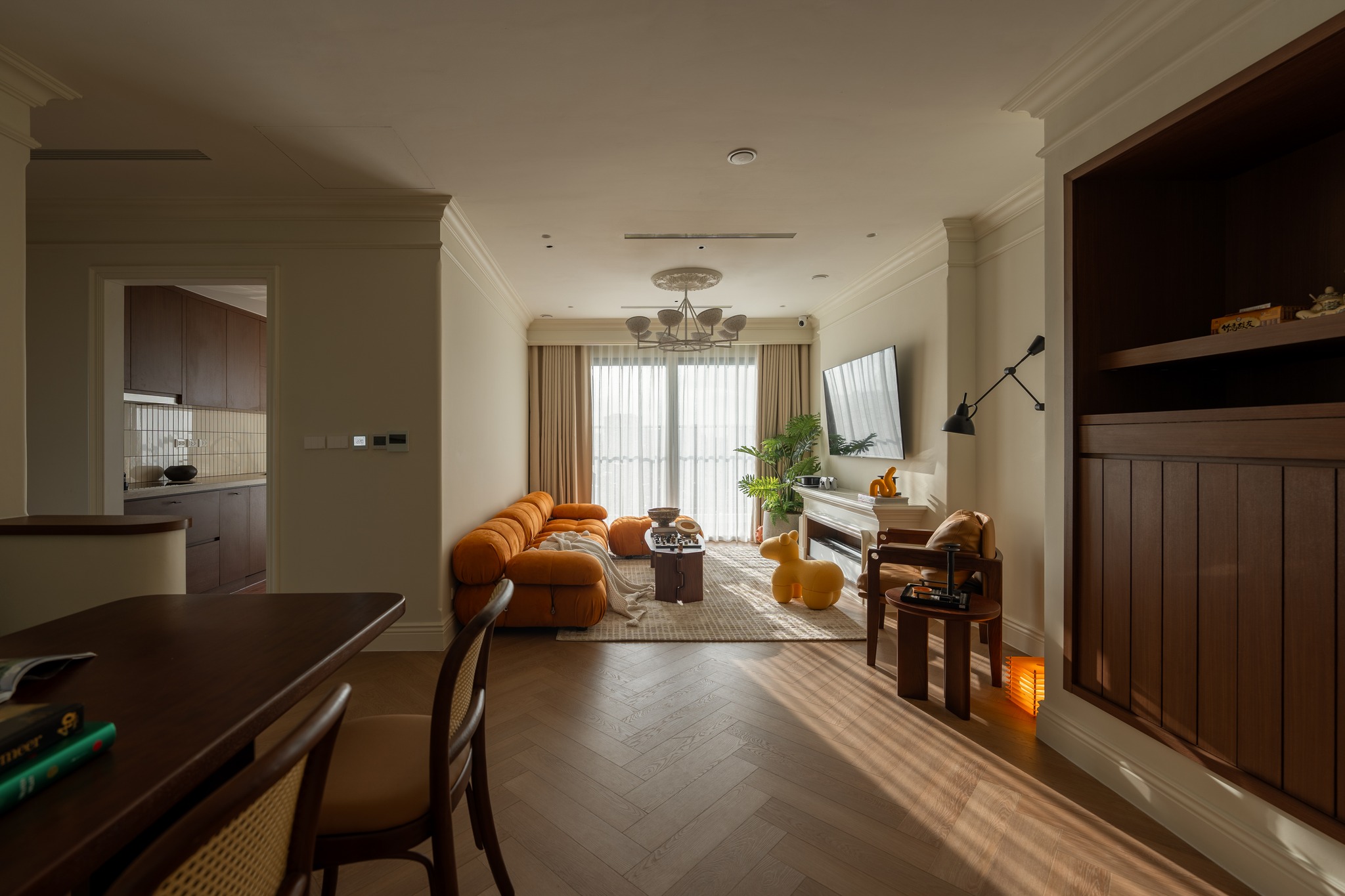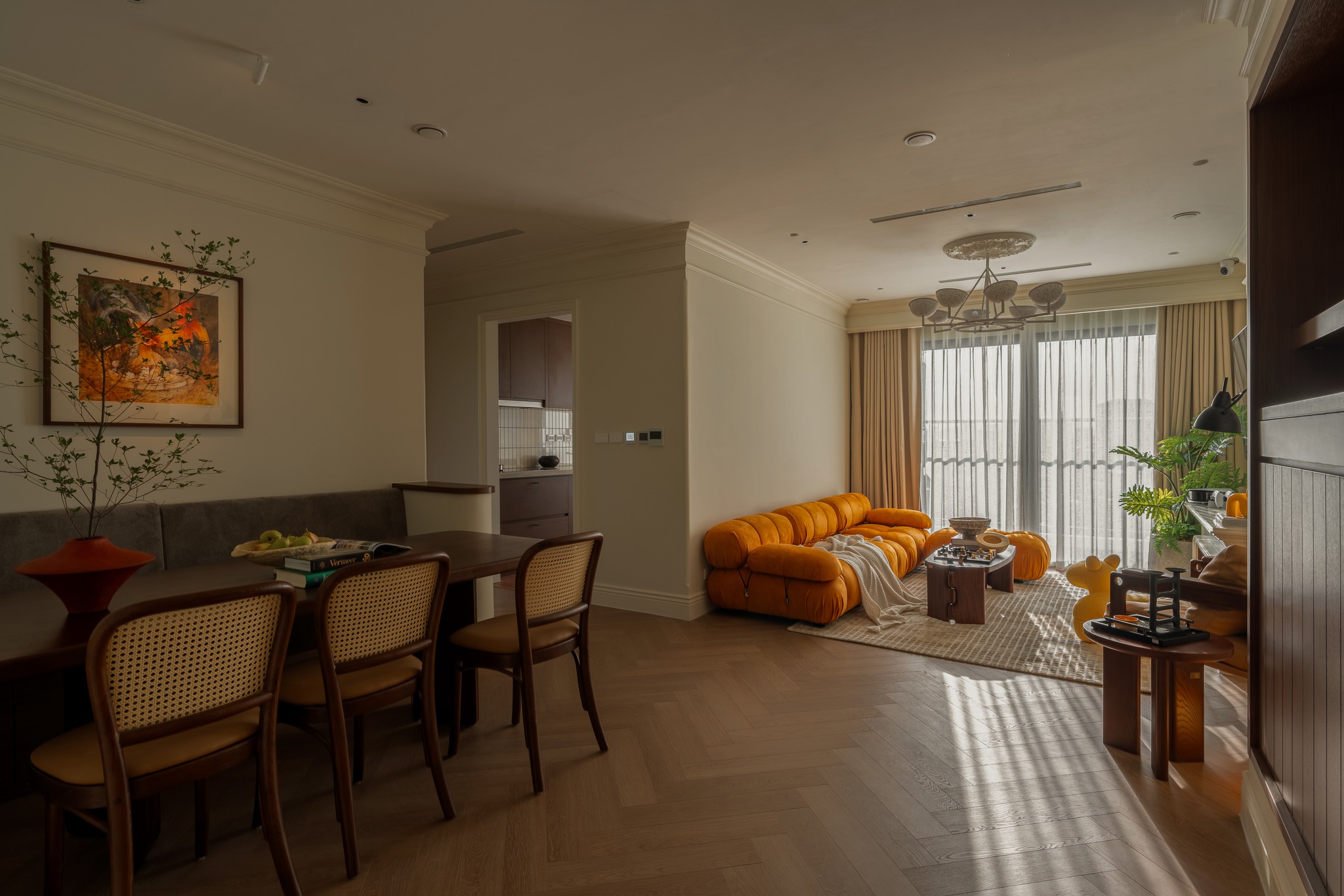 Về lựa chọn tone màu, là 1 thể nghiệm mới đối với cá nhân tôi khi mà các mảng tường sử dụng tone màu sáng hơn so với chính tôi của bình thường, cũng như lần đầu tiên sử dụng 1 tone sàn gỗ màu vàng ấm, kết hợp cùng với màu gỗ chocolate đậm ánh đỏ nhẹ của đồ nội thất liền tường và đồ nội thất rời mà lần đầu tiên tôi chủ đích sử dụng, cùng với 1 bộ sofa tone cam đậm và màu gạch nâu đỏ sẫm.