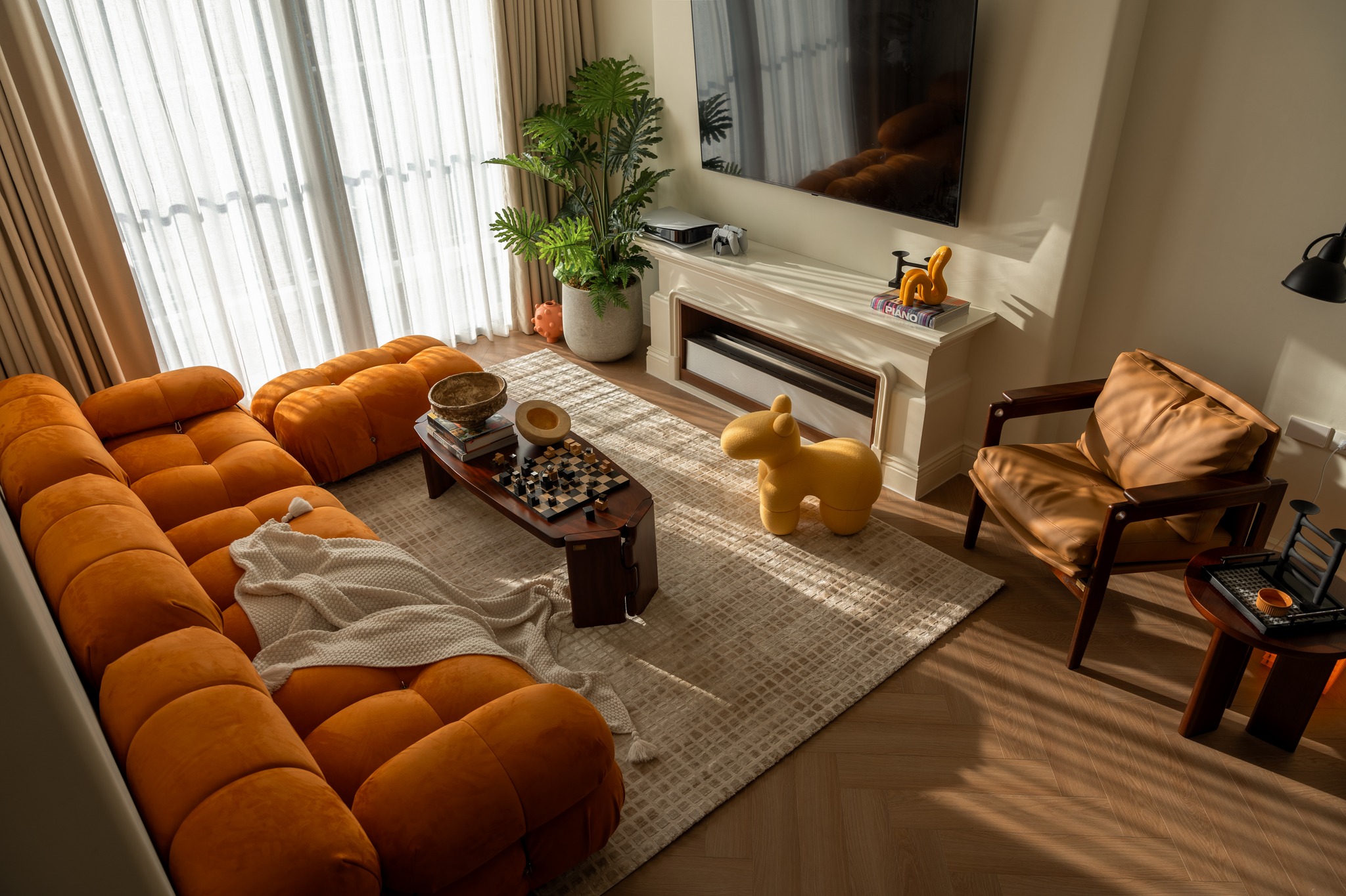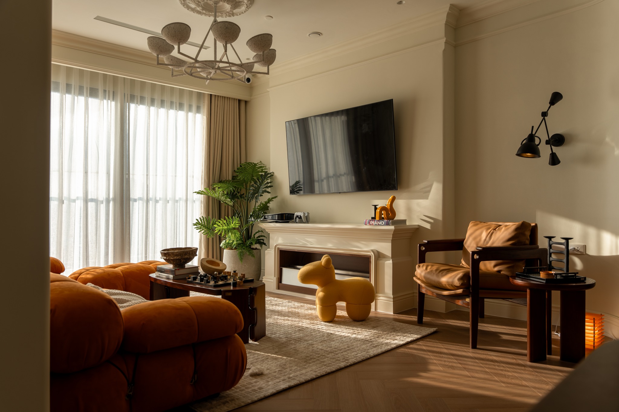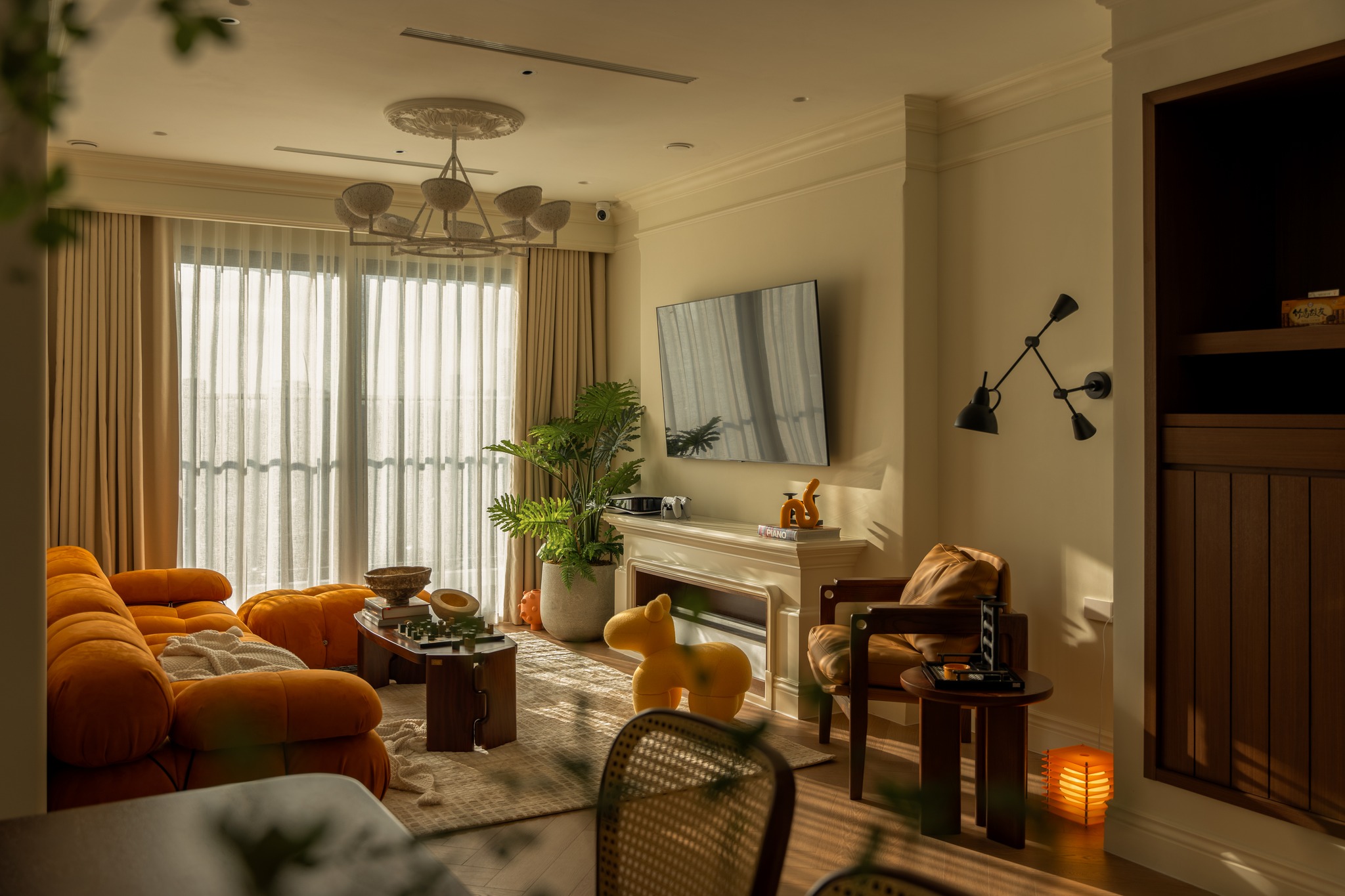 Về lựa chọn tone màu, là 1 thể nghiệm mới đối với cá nhân tôi khi mà các mảng tường sử dụng tone màu sáng hơn so với chính tôi của bình thường, cũng như lần đầu tiên sử dụng 1 tone sàn gỗ màu vàng ấm, kết hợp cùng với màu gỗ chocolate đậm ánh đỏ nhẹ của đồ nội thất liền tường và đồ nội thất rời mà lần đầu tiên tôi chủ đích sử dụng, cùng với 1 bộ sofa tone cam đậm và màu gạch nâu đỏ sẫm.