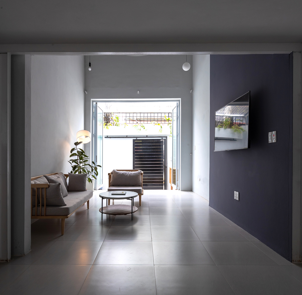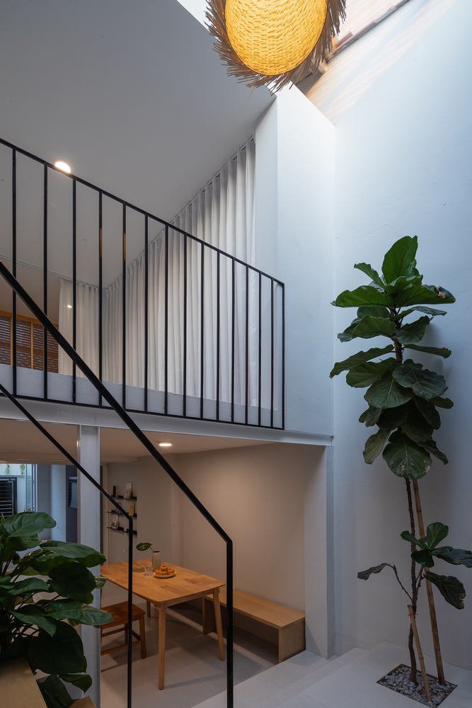 Việc nâng sàn phòng ngủ tạo nên sự mới mẻ, khô ráo cùng với tầm nhìn bao quát ngôi nhà. Điểm nhấn của ngôi nhà là không gian đệm trước phòng ngủ, là điểm kết nối giữa tầng trệt và tầng lửng, phòng ngủ, phòng khách.