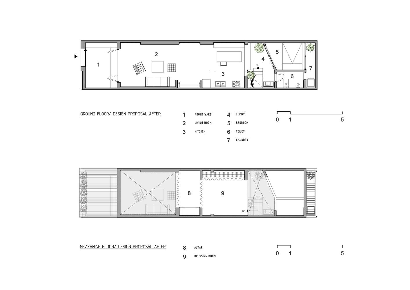 Kiến trúc sư đã đưa ra giải pháp thay đổi, bố trí lại các khu vực chức năng bằng cách hoán đổi vị trí bếp ăn và phòng ngủ, đồng thời đưa cầu thang ra khỏi gác lửng. Những bức tường ngăn cách đã được dỡ bỏ, không gian sống giờ đây được kết hợp và trở nên rộng rãi, mát mẻ hơn.