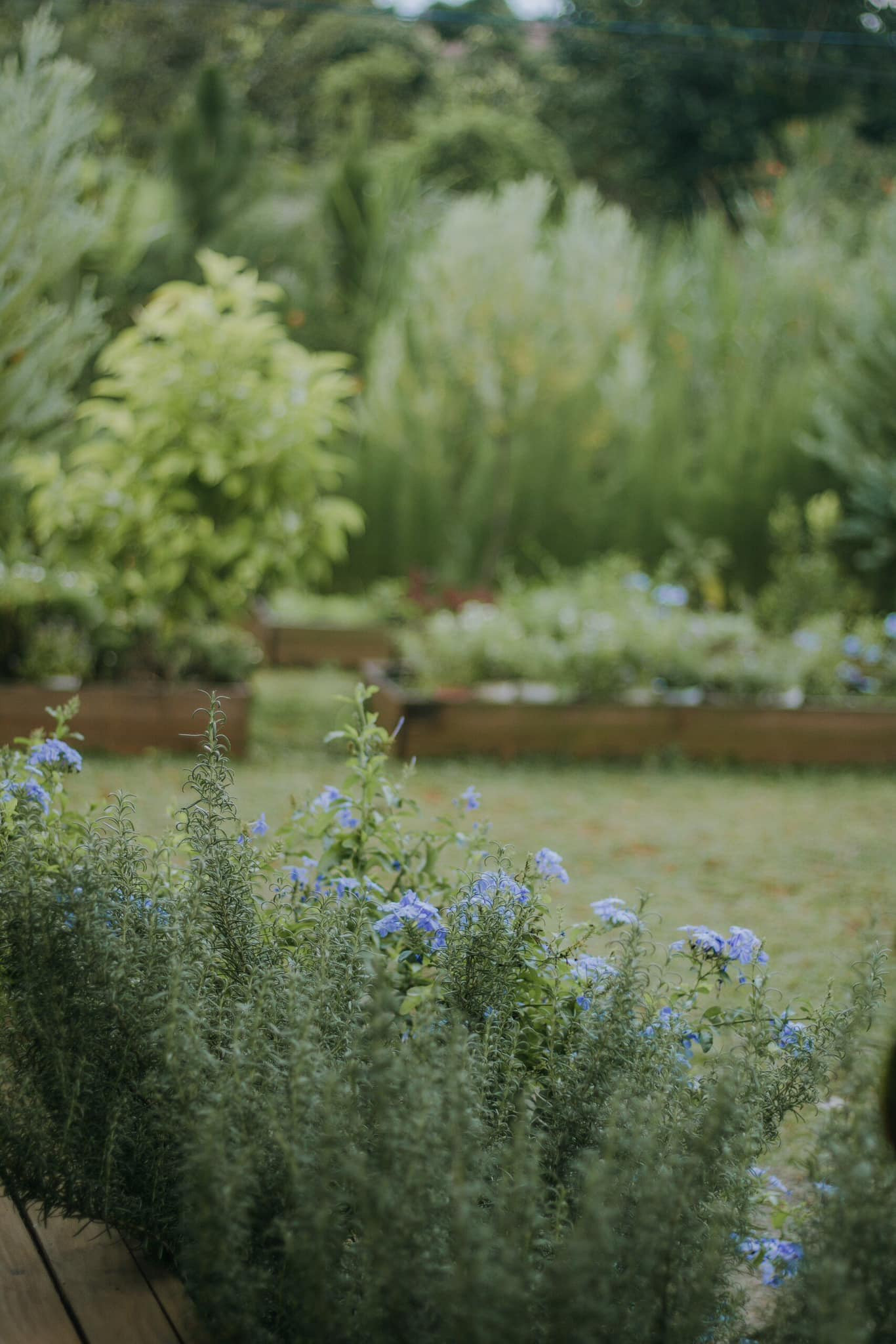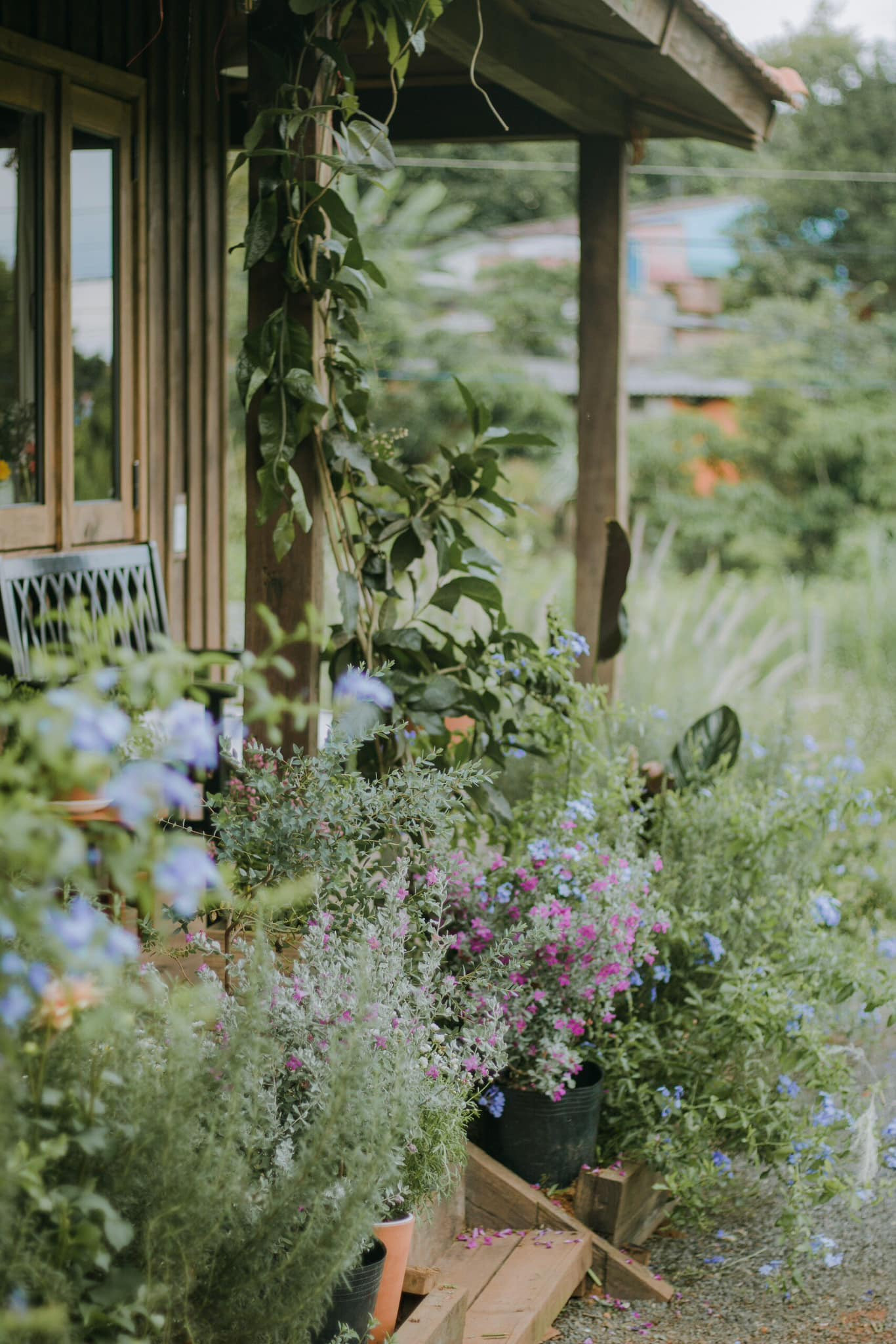 Quanh ngôi nhà là những chậu gỗ trồng hương thảo, cây dây leo... cùng bãi cỏ xanh