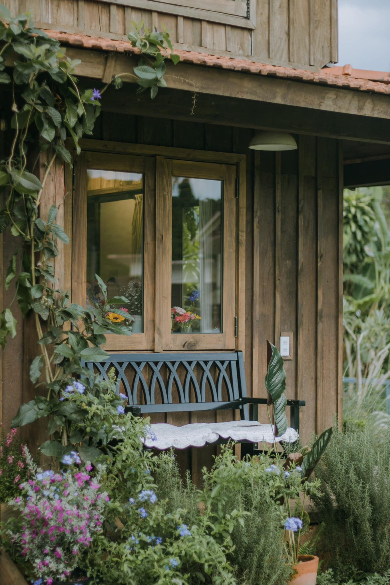 Ngôi nhà gỗ xinh đẹp nằm dưới chân đồi, bao quanh là cỏ cây, hoa lá.