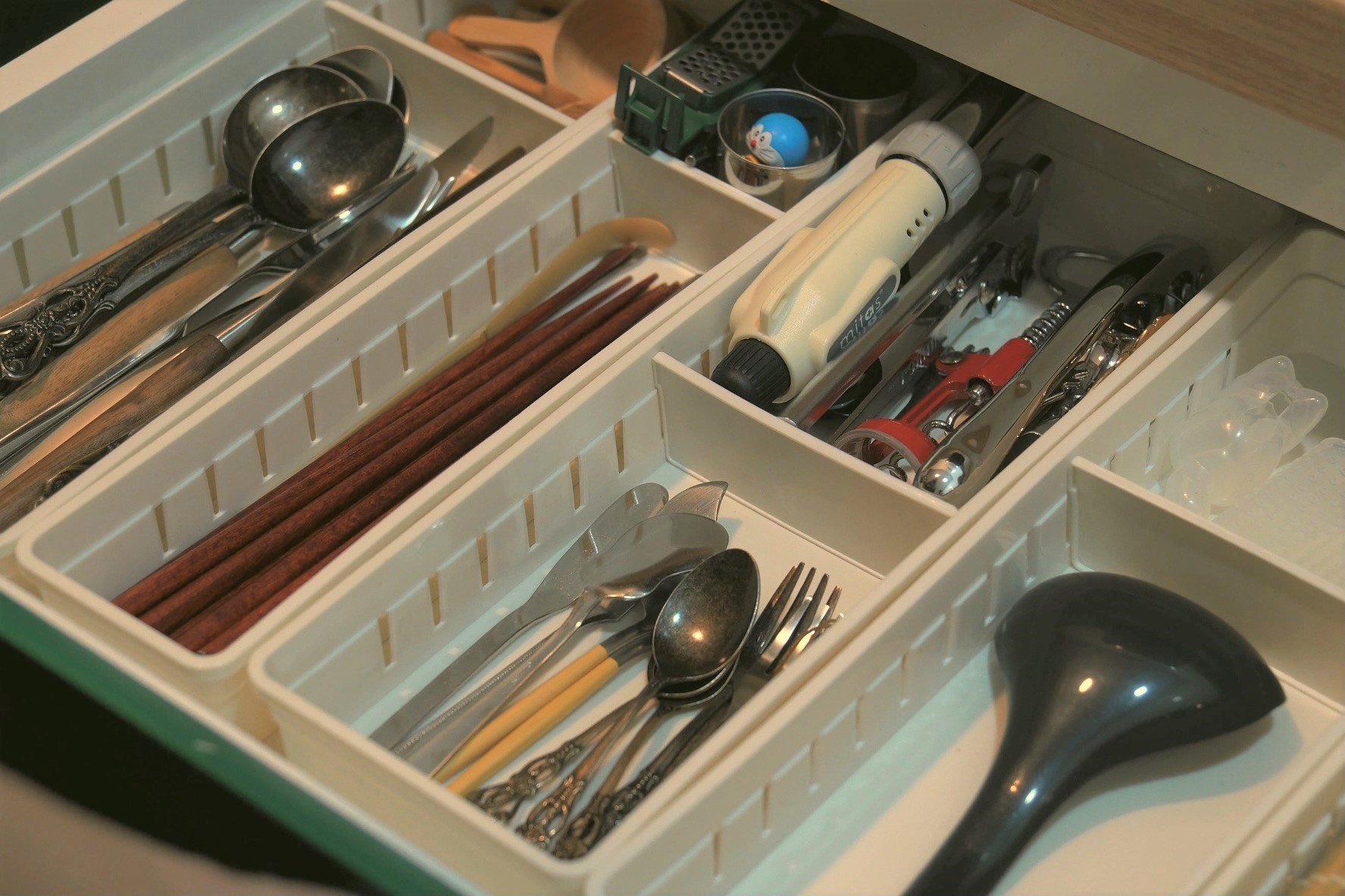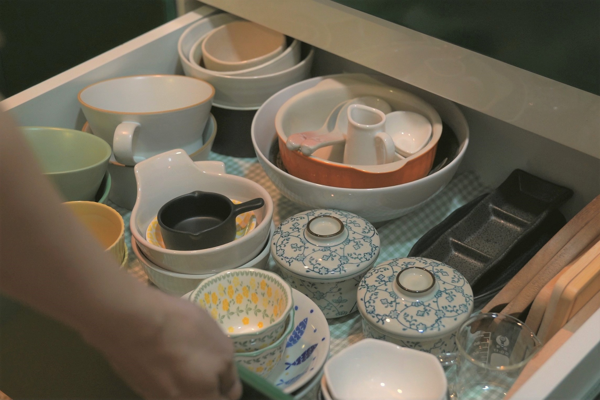 Cách sắp xếp trong các ngăn tủ của căn bếp cũ được Trúc áp dụng cho gian bếp mới. Cũng nhờ kỳ công đem phần lớn đồ dùng về, hai vợ chồng không tốn nhiều chi phí cho việc mua sắm lại vật dụng trong bếp.