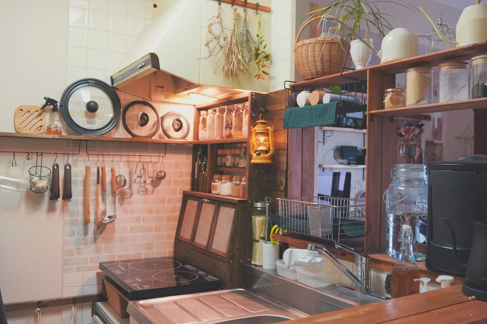 Vì bếp cũ diện tích hạn chế, Trúc đóng thêm kệ và lắp đặt nhiều giá treo tường để tận dụng tối đa không gian.