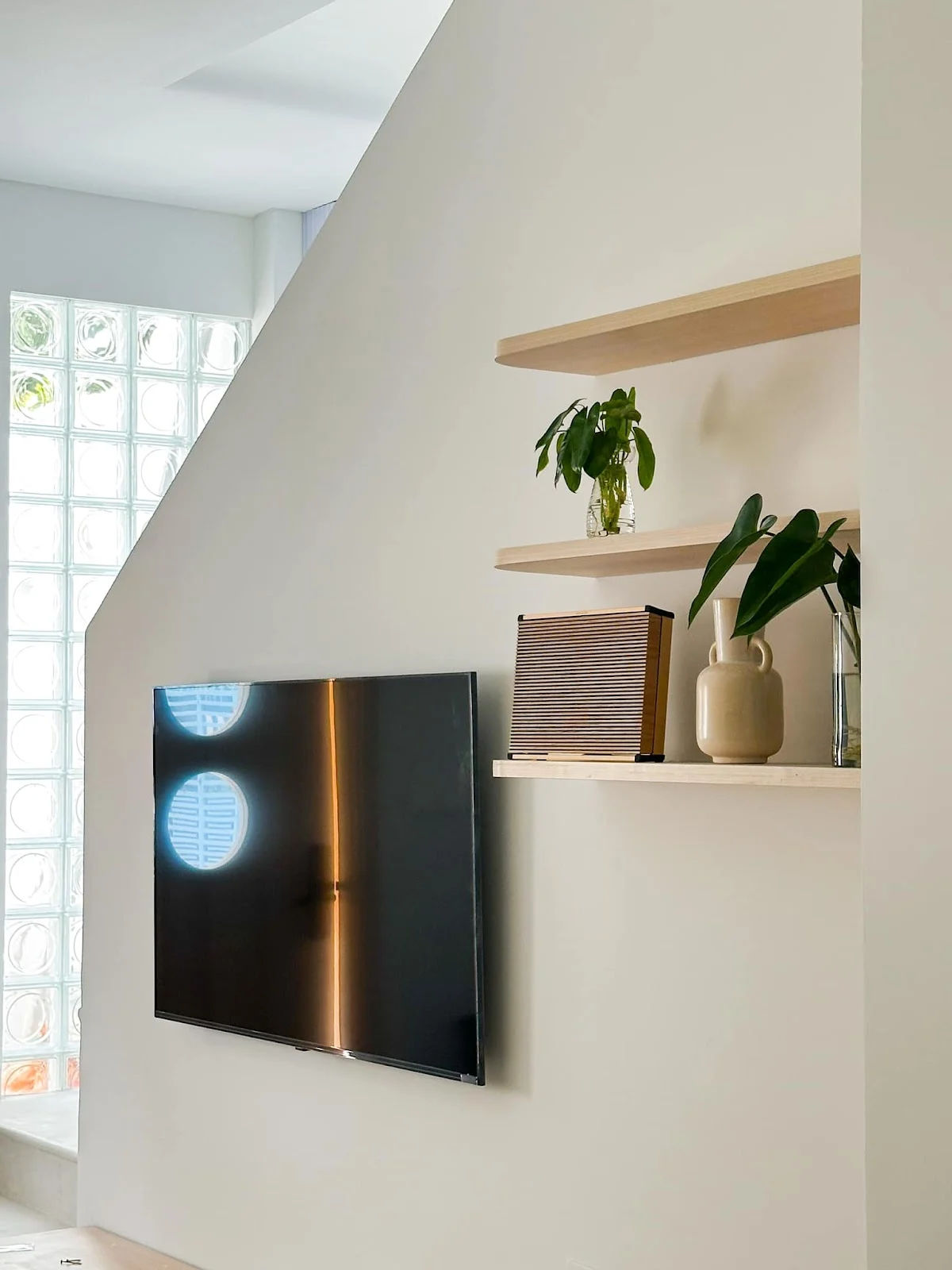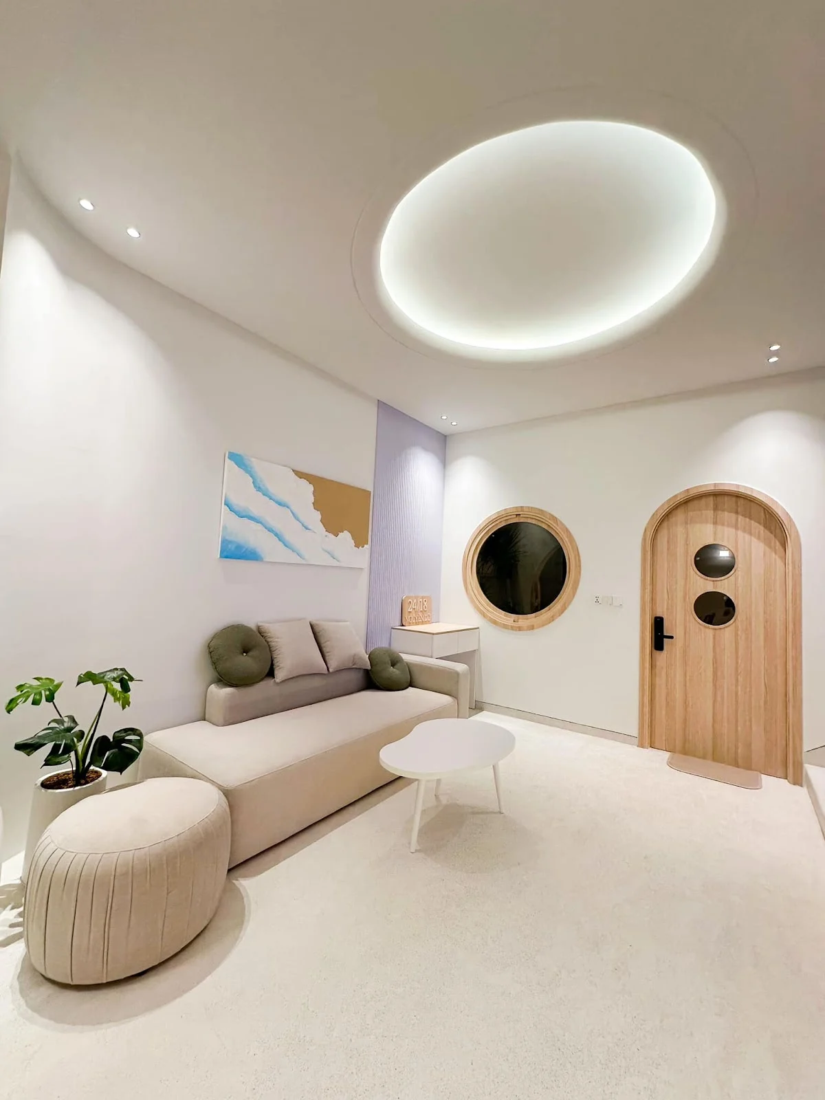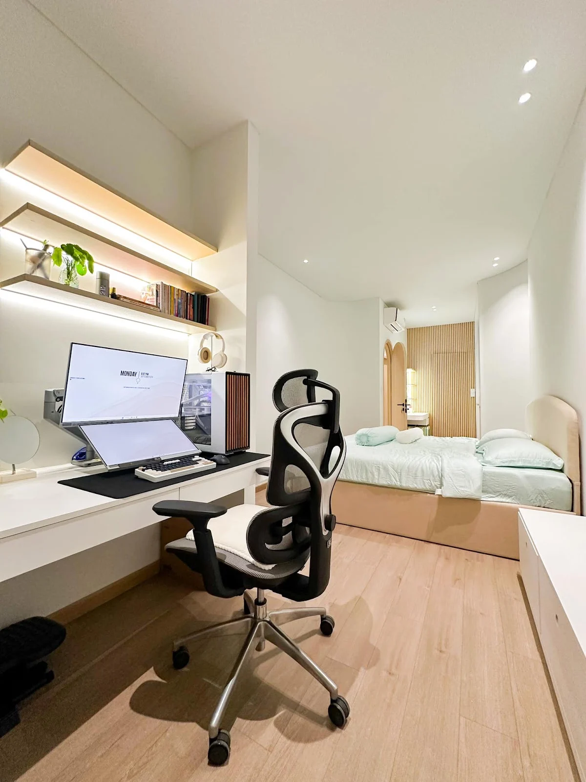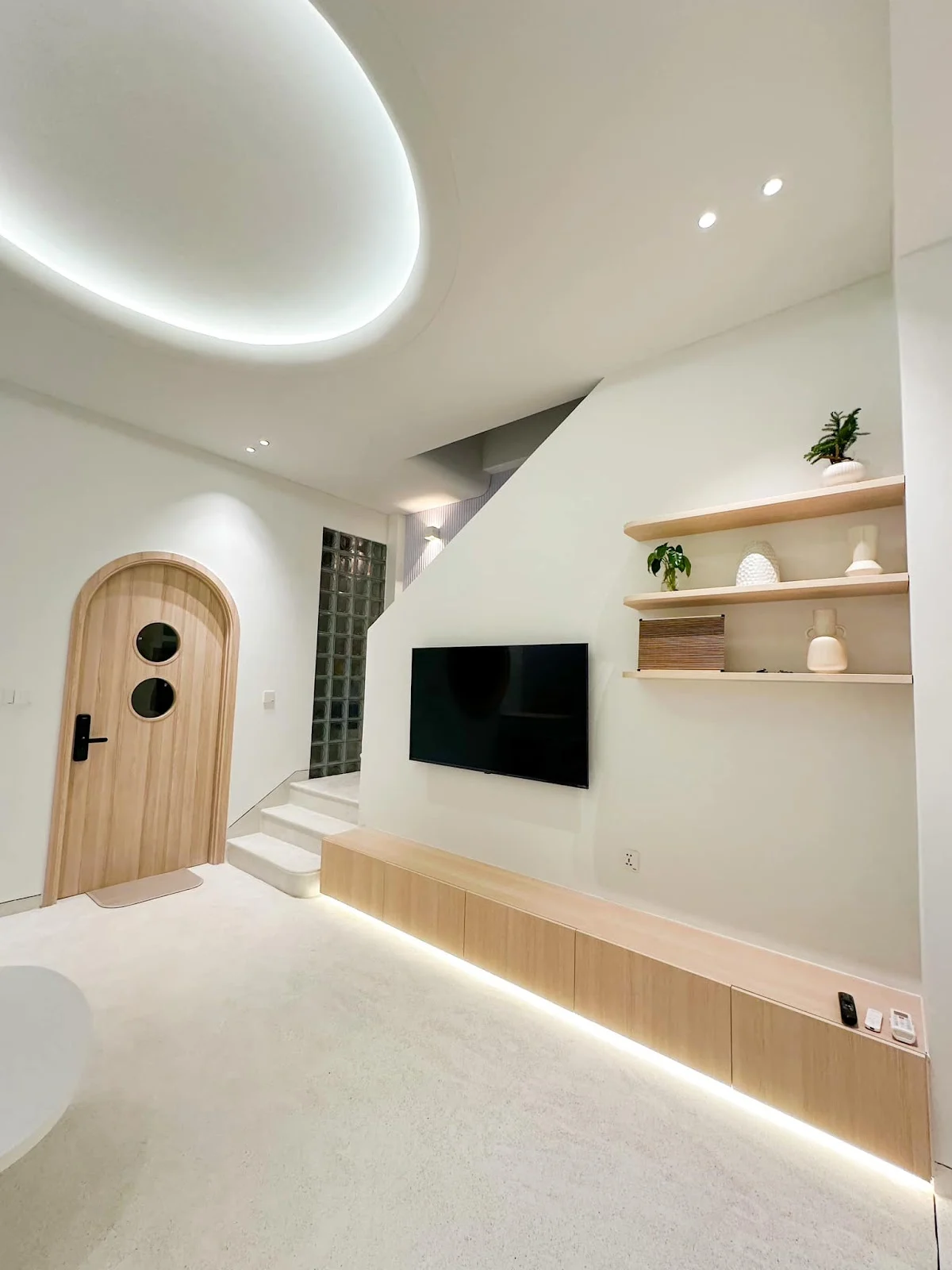 Toàn bộ nội thất trong nhà được đóng theo thiết kế riêng để phù hợp với thẩm mỹ và nhu cầu sử dụng của nhà mình. Đặc biệt, vợ chồng mình ưu tiên thiết kế nhiều đường cong, hình tròn để tạo cảm giác mềm mại, nhẹ nhàng, và vì nhà có em bé nên cũng hạn chế góc vuông để đảm bảo an toàn.